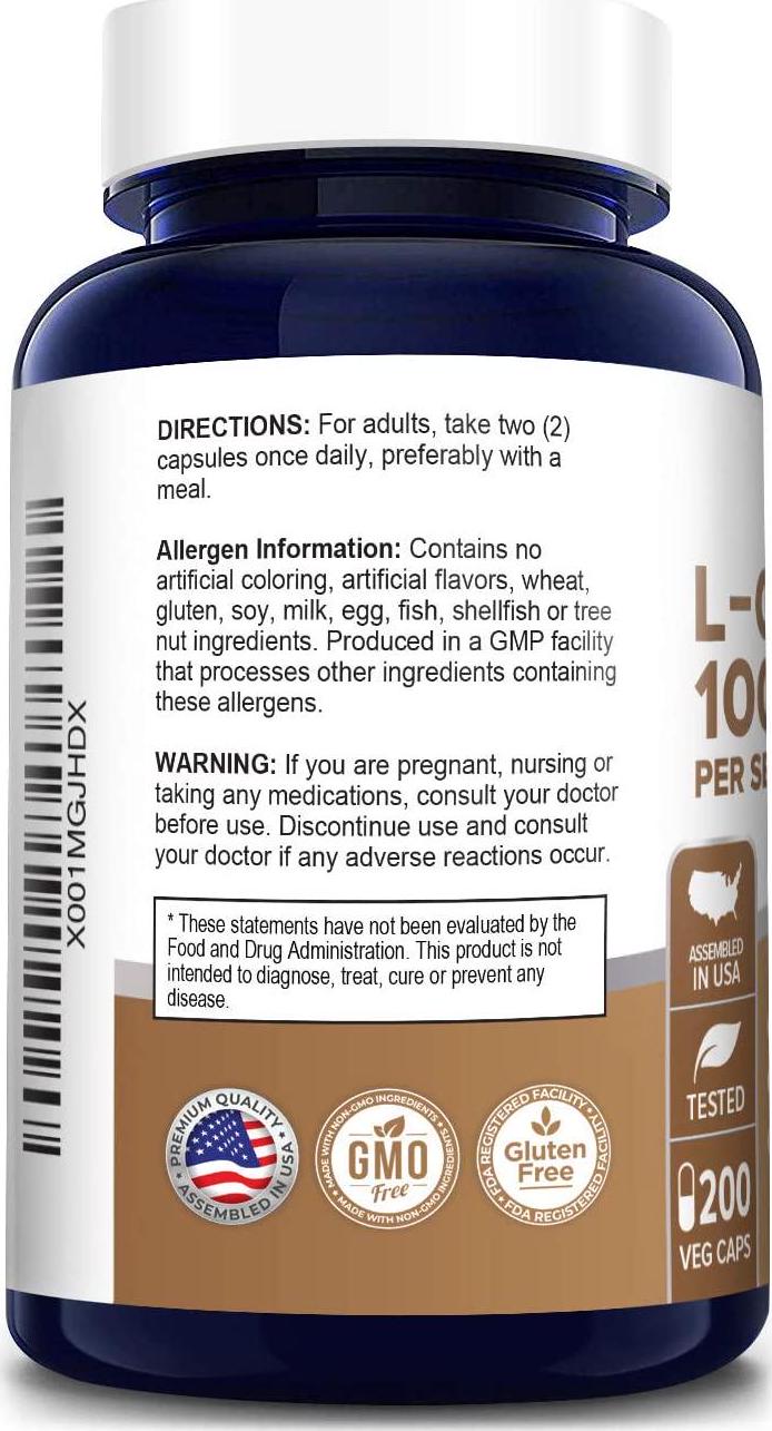 L-Glutamine 1000 mg 200 Capsules (Vegetarian, Natural, Non-GMO and Gluten Free)