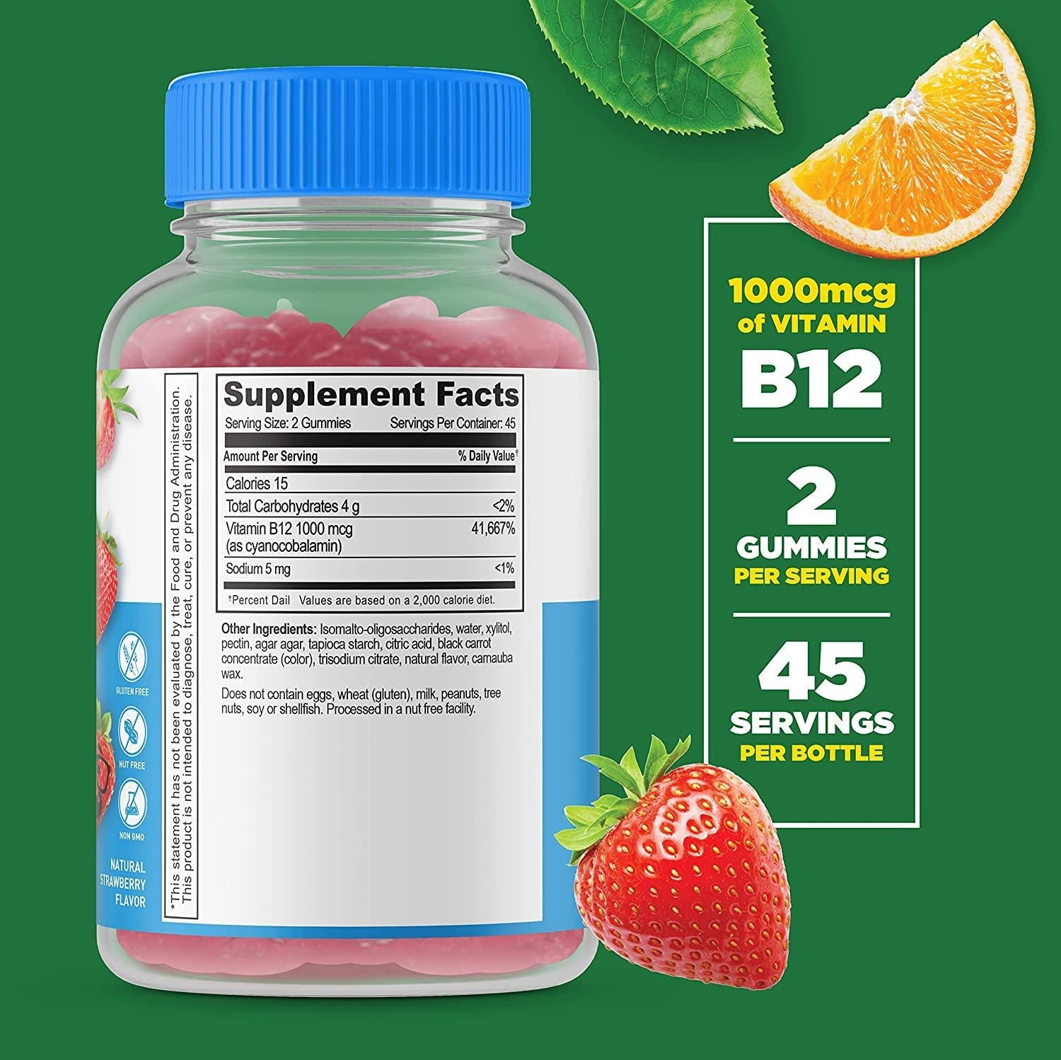 - GREAT TASTING STRAWBERRY FLAVOR GUMMY: These sugar free Vitamin B12 gummies have a fruity strawberry flavor everyone loves; they are pleasant and easy to chew; your children will beg you for their daily dose of vitamin candy.