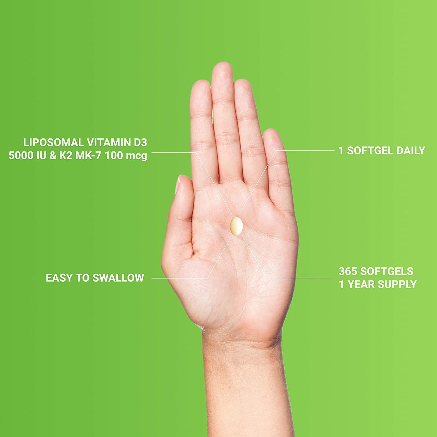 Liposomal Vitamin D3 K2 MK7-365 Softgels | VIT D3 5000 IU + K2 100 mcg with Organic Coconut Oil - K2 D3 Vitamin Supplement - Vitamin D and K Support Immune, Bone, Heart, Mood - Non GMO Gluten Free