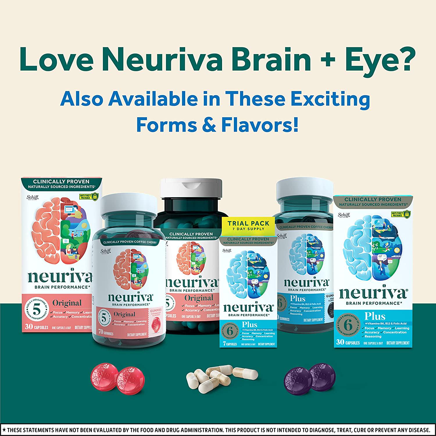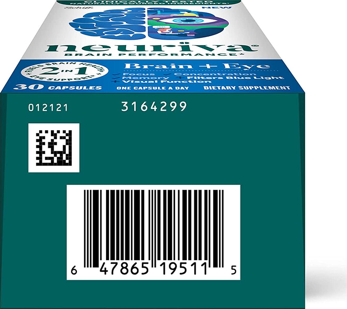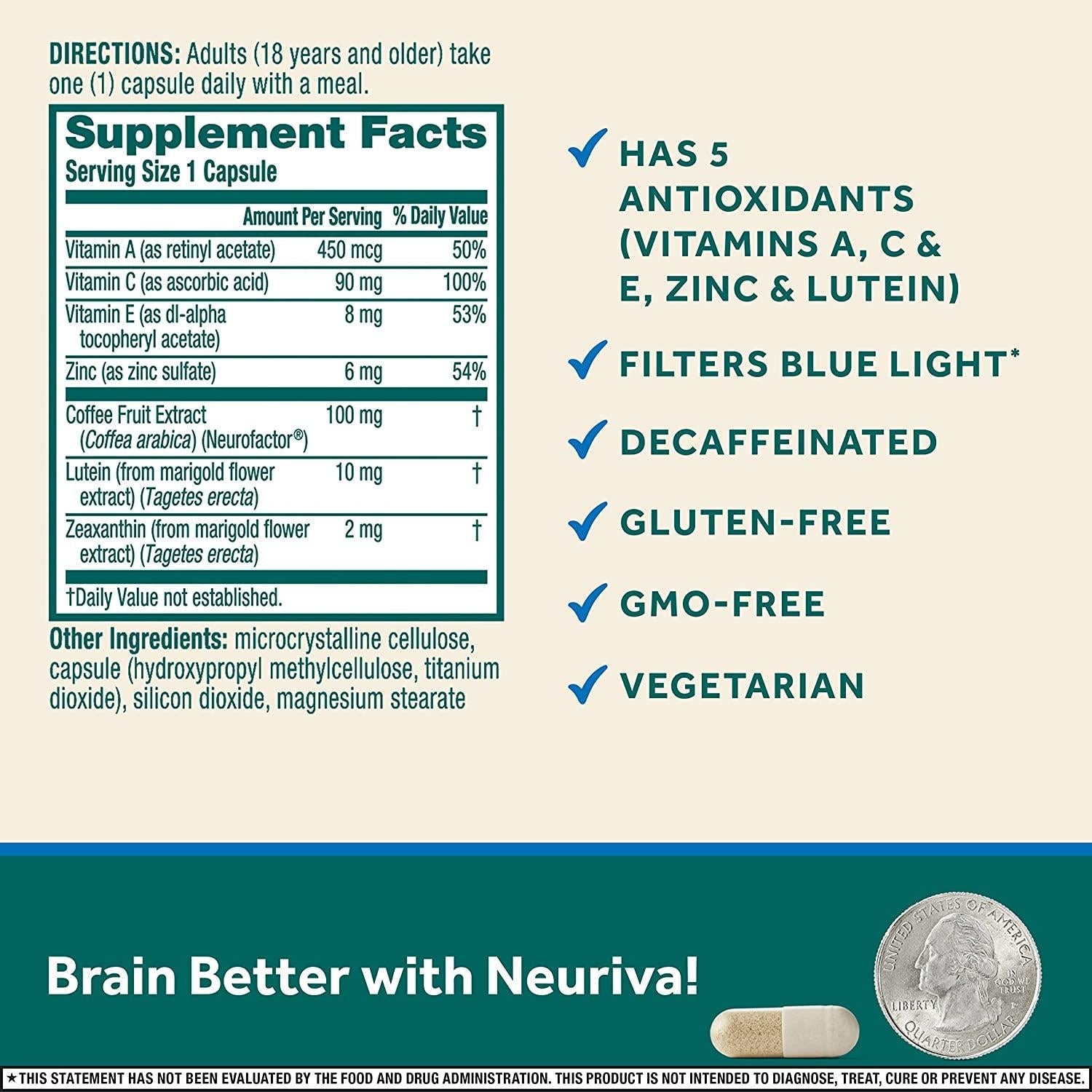 NEW from Neuriva Brain Performance comes Brain + Eye capsules. The Neuriva team is passionate about brain health and seeks to bring you science backed brain health supplements inspired by the best of nature. When you take Neuriva Brain + Eye capsules, they fuel Memory, Focus, Concentration, Visual Function and help Filter Blue Light.* These capsules are also decaffeinated, Vegetarian, GMO-Free, and Gluten-Free. This unique formula contains 5 antioxidants to nourish your eyes: Vitamin A, Vitamin C, Vitamin E, Zinc and Lutein. Made with naturally sourced & clinically tested Coffee Cherry (Neurofactor) and Lutein (Lutemax). Neurofactor (decaffeinated coffee cherry) comes from the nutrient-rich fruit of the coffee cherry. This whole fruit extract is decaffeinated and clinically tested to increase levels of the vital protein BDNF. BDNF is short for brain-derived neurotrophic factor. This protein (which is found in the brain) has been known to strengthen connections between brain cells.* Lutemax (Lutein & Zeaxanthin) is naturally derived from marigold extract and has been clinically tested & shown to support key indicators of eye health.* Get Braining! Download our NEURIVA BRAIN GYM app from the App Store or Google Play to start assessing your skills and building your brain fitness routine. Our App has been recently updated with a soothing spa section to help calm the mind. Because when your brain wins, you win! THESE STATEMENTS HAVE NOT BEEN EVALUATED BY THE FOOD AND DRUG ADMINISTRATION. THIS PRODUCT IS NOT INTENDED TO DIAGNOSE, TREAT, CURE OR PREVENT ANY DISEASE. Neurofactor (Coffee Cherry) & Lutemax.
