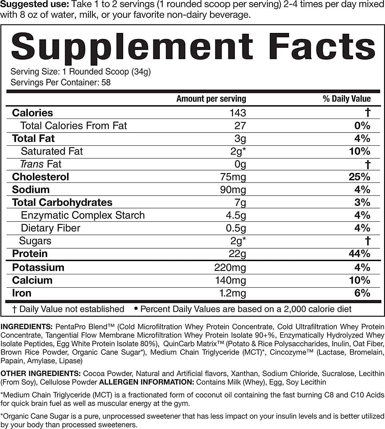 - Ingredients: PentaPro BlendTM (Cold Microfiltration Whey Protein Concentrate, Cold Ultrafiltration Whey Protein Concentrate, Tangential Flow Membrane Microfiltration Whey Protein Isolate 90+%, Enzymatically Hydrolyzed Whey Isolate Peptides, Egg White Protein Isolate 80%), QuinCarb MatrixTM (Potato & Rice Polysaccharides, Inulin, Oat Fiber, Brown Rice Powder, Organic Cane Sugar*), Medium Chain Triglyceride (MCT)*, CincozymeTM (Lactase, Bromelain, Papain, Amylase, Lipase)See more