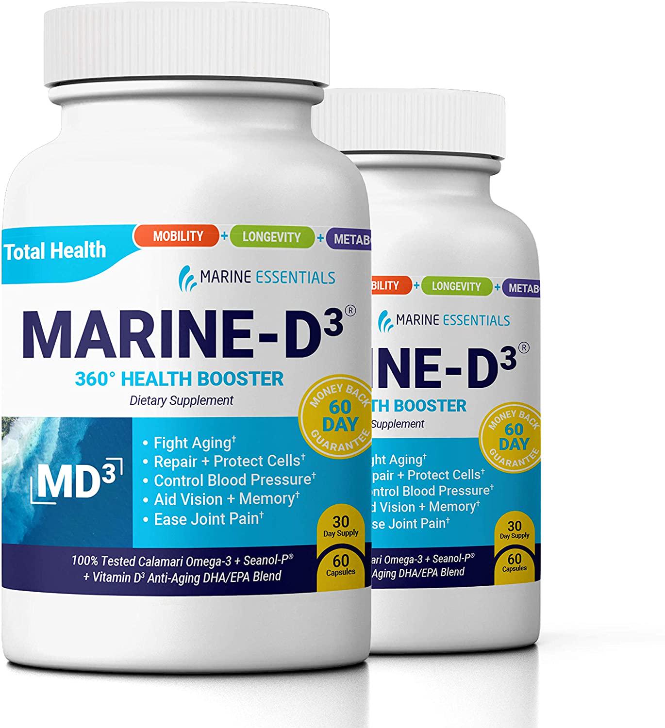 "MARINE-D3 IS MY WAY TO A YOUNGER ME." - POTENT 340MG VITAMIN D3 DHA OMEGA 3 FISH OIL SUPPORT 360° HEALTH. Brain, skin, heart, eyes, arteries - all deteriorate as we age. Take a Marine-D3 DHA omega 3 fish oil dietary supplement to aid memory, flexibility, skin tone, blood pressure and vision. GET FAST-ACTING WHOLE-BODY RELIEF. Marine-D3 is your first choice for an all-in-one Vitamin D3 omega 3 fish oil dietary supplement. PROMOTE INCREASED NUTRIENT ABSORPTION. Trust the Marine-D3 formula to deliver Vitamin D3 and antioxidant-rich nutrients to the entire body - even areas the brain that are walled off by fatty tissue that commonly resist absorption. UNIQUE INGREDIENTS. Calamarine and Seanol-P are only in Marine-D3; a proprietary formula that contains a more potent, fat-soluble variety of omega 3 fish oil. Order today and, as always, enjoy our ironclad 60-Day Money Back Guarantee - feel better faster with our natural dietary supplement or your money back, no questions asked. "FINALLY, AN ALL-IN-ONE OMEGA 3 FISH OIL OPTION." - ONCE A DAY FOR SUPER CELL HEALTH A POTENT 340MG ANTI-AGING FORMULA. Free radicals are causing oxidative stress in your body right now. Marine-D3's proprietary Vitamin D3, DHA and omega 3 fish oil combo plays offense and defense - fighting free radicals while repairing and protecting cells all at once. PHYSICIAN-FORMULATED BLEND. Marine-D3 is the product of research by trusted Marine Essentials partner physicians and dieticians to develop cutting-edge antioxidant DHA supplements. BETTER THAN OTHER DHA SUPPLEMENTS. Marine-D3 delivers 85% more DHA, an omega 3 fatty acid found in brain, skin, organ and retinal tissue, via its proprietary omega 3 fish oil formula. NO ARTIFICIAL COLORS, FLAVORS OR PRESERVATIVES. Marine-D3 is a natural dietary supplement made with high-quality ingredients.