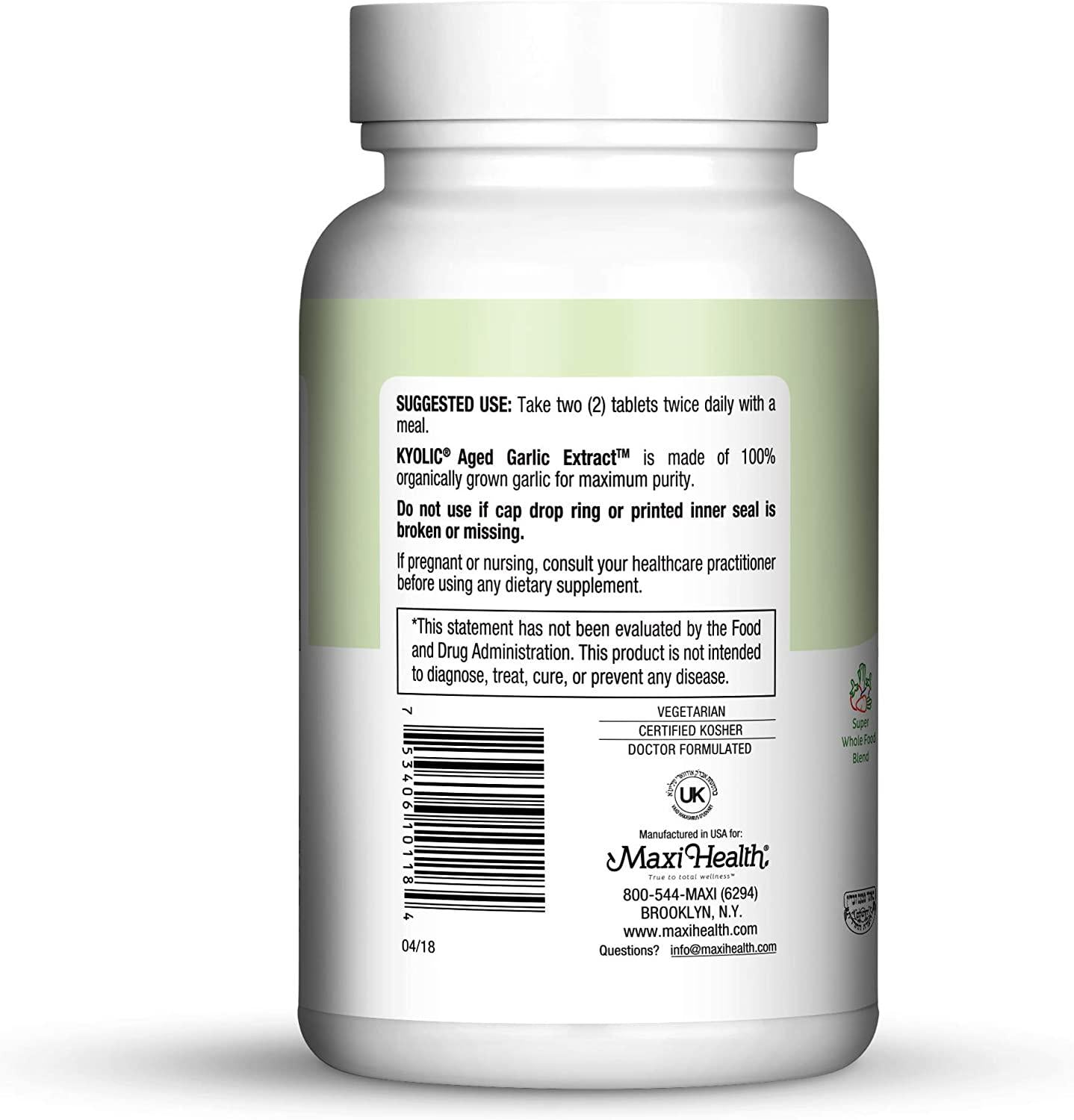 The exclusive aging process used eliminates garlic odor and harsh side effects. Moreover, it contains various antioxidant properties. Kyolic whole clove garlic is grown in specially prepared, organically rich, and uncontaminated soil. Furthermore, no pesticides are used in growing Kyolic Garlic. Kyolic is the first garlic supplement to offer standardized levels of SAC (S-Allyl Cysteine). SAC represents many important, valuable, stable and safe principles of garlic. Get Kyolic Aged Garlic Extract Tablets, only from Maxi Health! Our uncompromising commitment to quality begins with selecting the finest raw materials from across the globe, to high standard manufacturing practices in GMP certified facilities, in the USA.All Maxi Health products are certified kosher, under the Orthodox Union (OU) and the Udvari Kashruth (UK). Legal Disclaimer: These statements have not been evaluated by the FDA. This Product is not intended to diagnose, treat, cure or prevent any disease.