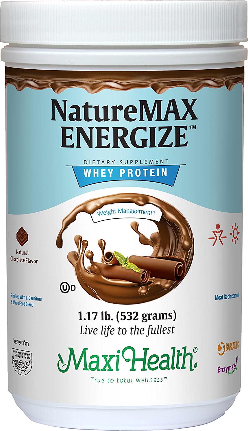 Maxi-Health NatureMax Energize Whey Protein Powder- Energy Support Meal Replacement - 20g Protein Per Serving - Natural Chocolate Flavor - Kosher Dairy Vitamin - 1.17lb