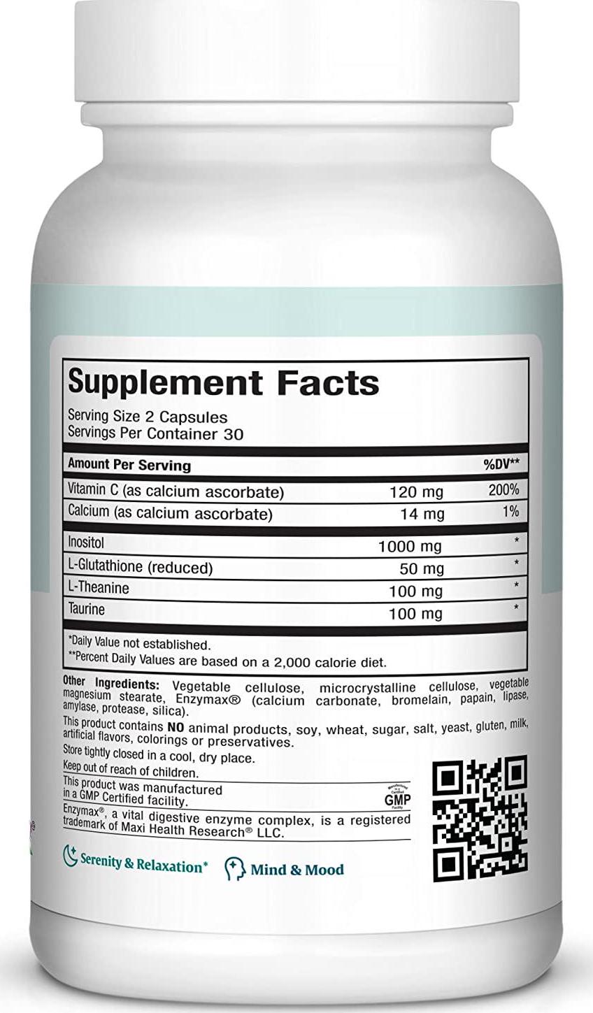 We at Maxi Health Research have developed a revolutionary natural formula to combat stress and promote relaxation. Relax to the Max is formulated with Inositol, L-Theanine, L-Taurine and other important nutrients to provide you with maximum relaxation.Inositol is present in all tissues of the body, with highest levels in the brain. It supports the nervous system, and may have calming effects.L-Theanine is a unique amino acid derived from Glutamic Acid. It has been shown to promote a restful, relaxed state, ease occasional simple nervous tension, reduce stress, and ease nervousness due to common every day overwork and fatigue. L-Theanine promotes alpha wave generation in the brain and has also been found effective in reducing disturbance of sleep often associated with the use of caffeine. We at Maxi Health Research use the Suntheanine form of l-theanine which is 100% safe with no known drug interactions, side effects or any limits.Because Theanine promotes alpha wave generation in the brain, a relaxed physical and mental condition is achieved.We at Maxi Health Research use the Suntheanine form of L-Theanine. Suntheanine has been extensively researched and documented with over 45 different studies currently available. Suntheanine is 100% safe with no known drug interactions, side effects or any limits.Vitamin C, l-glutathione, and l-taurine are included to support against stress hormones.Get the most out of a hectic life with Relax to the Max!