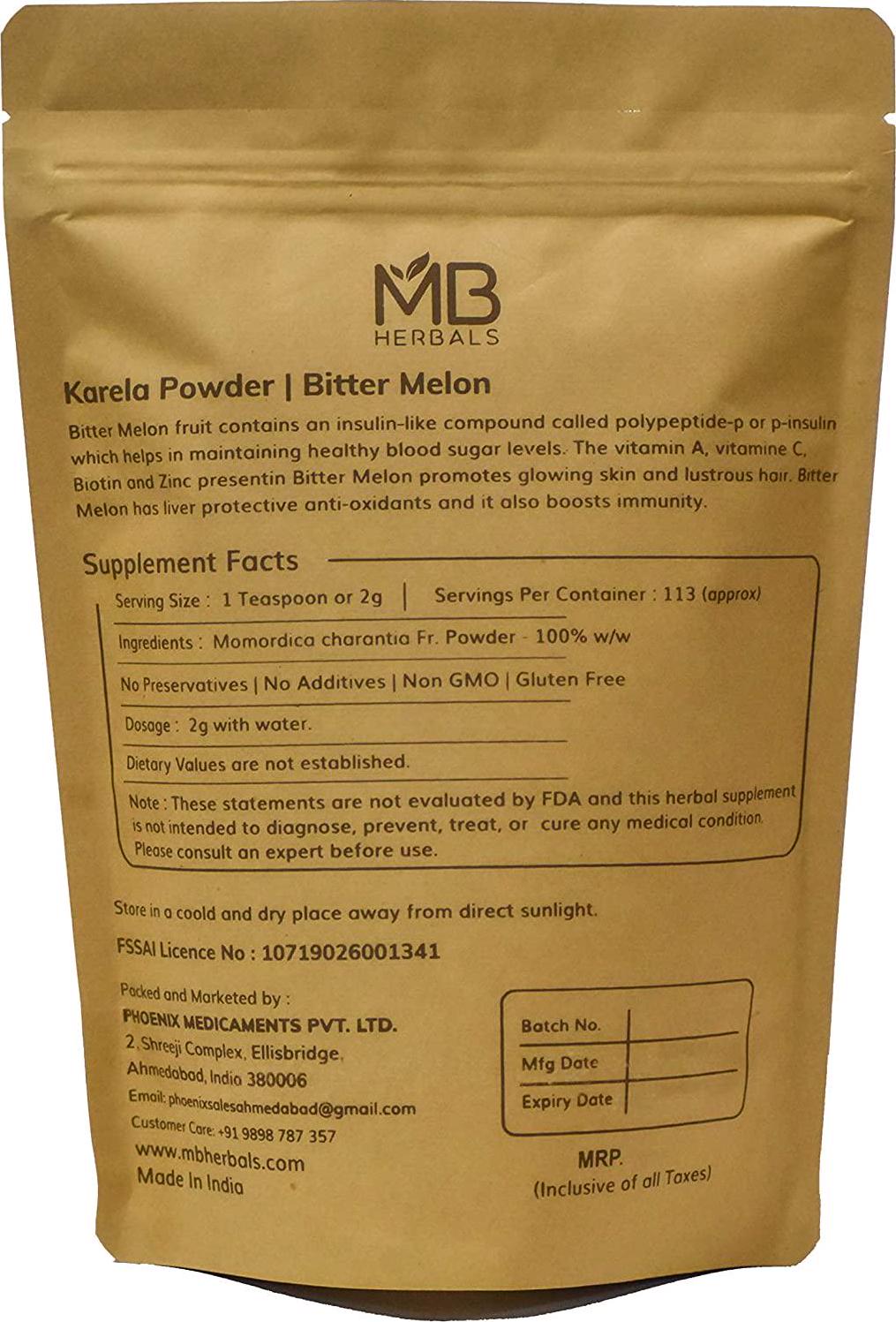 - MB Herbals Karela Powder is 100% Karela Fruit Pulp Powder.