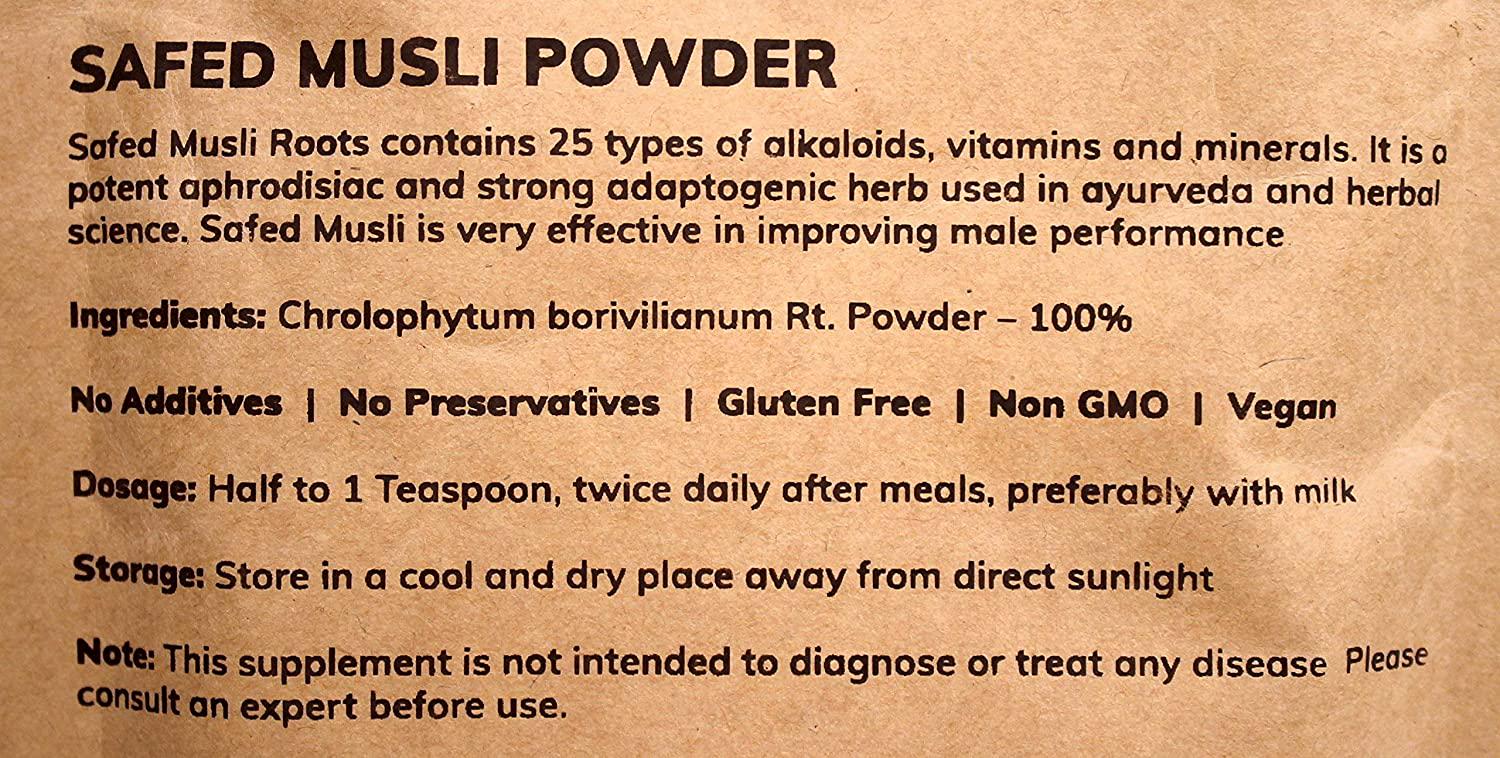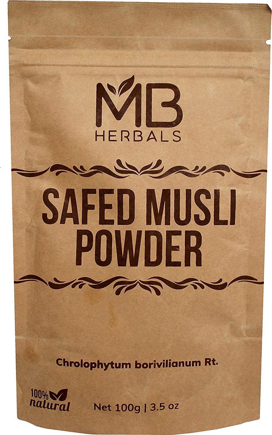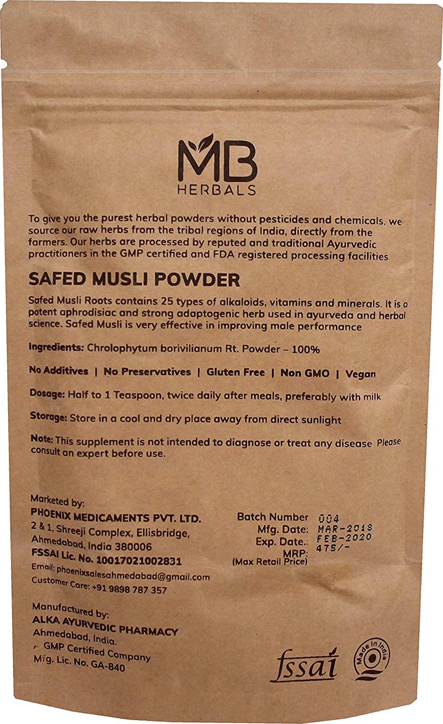 - MB Herbals Safed Musli Powder is 100% Pure. No Additives or Fillers. No Preservatives. It is processed from Non GMO (by traditional cultivation).