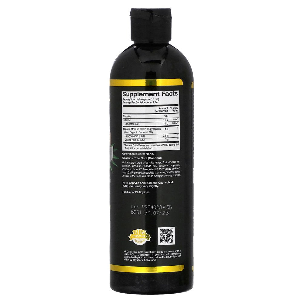 California Gold Nutrition SPORTS Organic MCT Oil, 12 fl oz Featuring Medium Chain Triglycerides from USDA Organic Coconut Oil Supports a Ketogenic Diet* Plant-Based Brain and Body Fuel* Suitable for Vegetarians Formulated without Gluten, GMOs, Palm, or Soy Produced in a 3rd Party Audited cGMP Registered (Certified) Facility 100% Gold Guarantee Medium chain triglycerides, or MCTs, are nutritious fats that the body can quickly burn for energy, making them a vital source of fuel. California Gold Nutrition SPORT Organic MCT Oil contains MCTs sourced from organic coconut oil, allowing you to easily add an extra energy kick to salad dressings, smoothies, and other favorite recipes. It is an excellent source of plant-based brain and body fuel and is a popular choice for athletes and those looking to lose weight.* MCT Oil Benefits Coconut oil is a healthy source of MCTs and contains caprylic acid and capric acid, two types of medium chain triglycerides that the body can convert into ketones and use for fuel. This means MCTs can act as an important fuel source and can help support a Ketogenic diet.* Research into the health benefits of a Ketogenic diet suggest a range of benefits, from weight loss to athletic endurance and cognitive focus.* California Gold Nutrition SPORT Organic MCT Oil contains multiple MCTs from organic coconut oil, including caprylic and capric acid. It contains no gluten, GMOS, palm, or soy. Third-Party Tested Our products undergo quality testing where they are evaluated by an independent ISO-certified lab using scientifically-validated test methods to ensure authenticity, purity, and potency of ingredients. For added transparency, we make the results available to you in our iTested Verified Reports so you can see for yourself. Check out the iTested Report for this product to see the analysis.