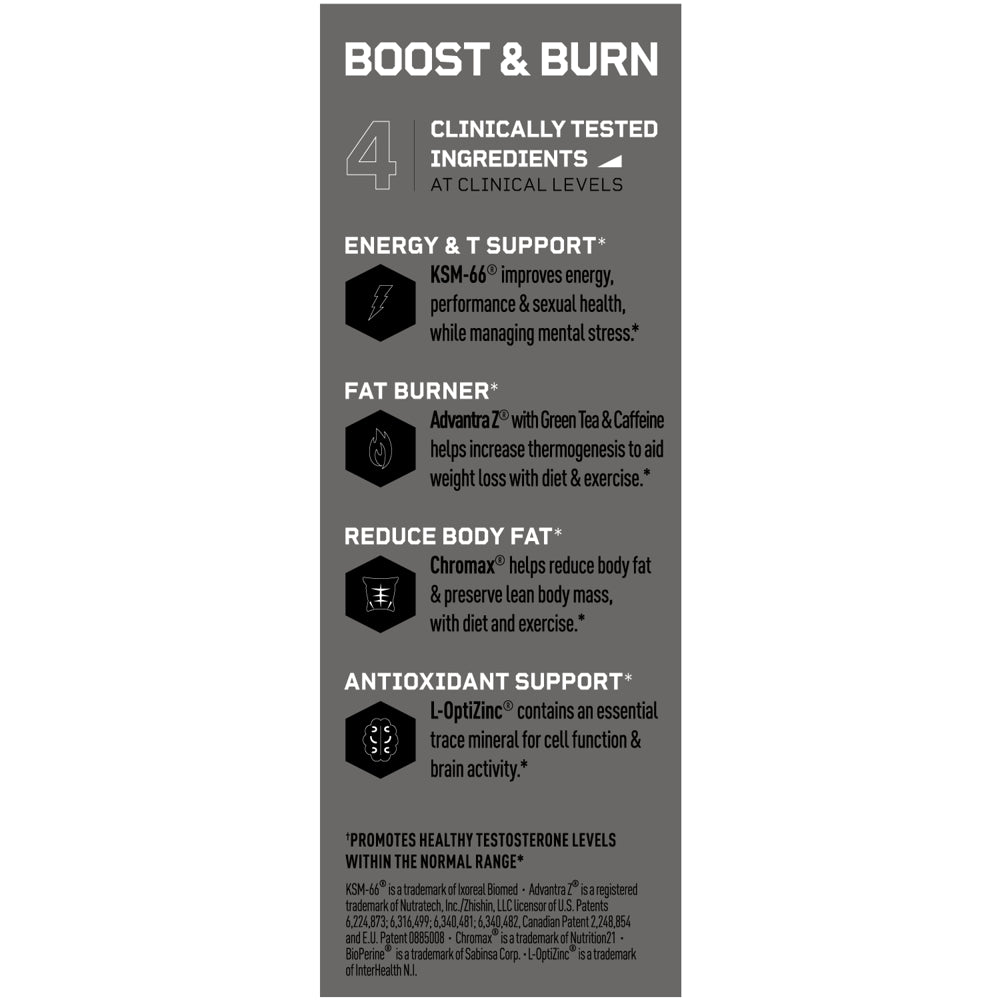 Mdrive Boost & Burn was specifically designed for guys determined to lose a few extra pounds. Powerful Clinically Tested Ingredients, 600mg KSM 66 Ashwagandha, 200mcg Chromium (from Chromax), 15mg Zinc (from L-Optizinc), 5mg Bioperine, 100mg Advantra Z per serving.
