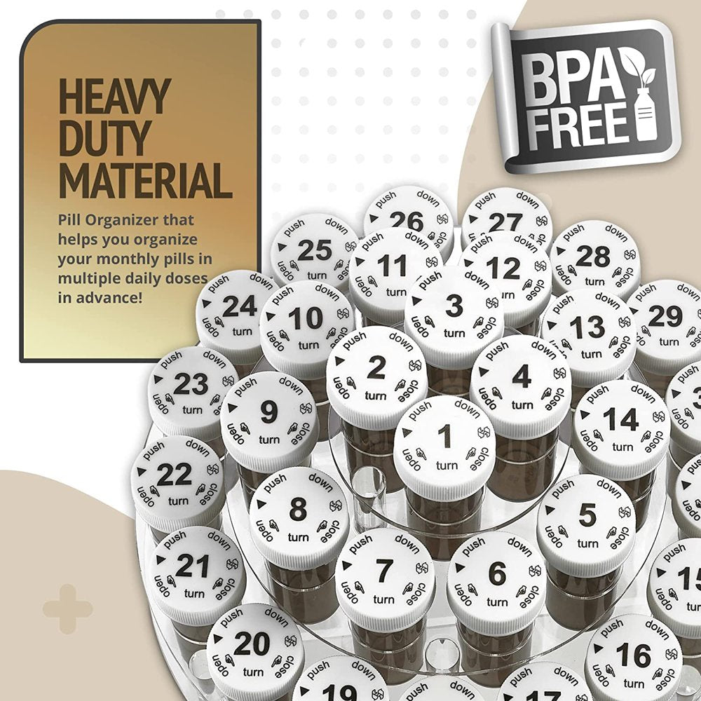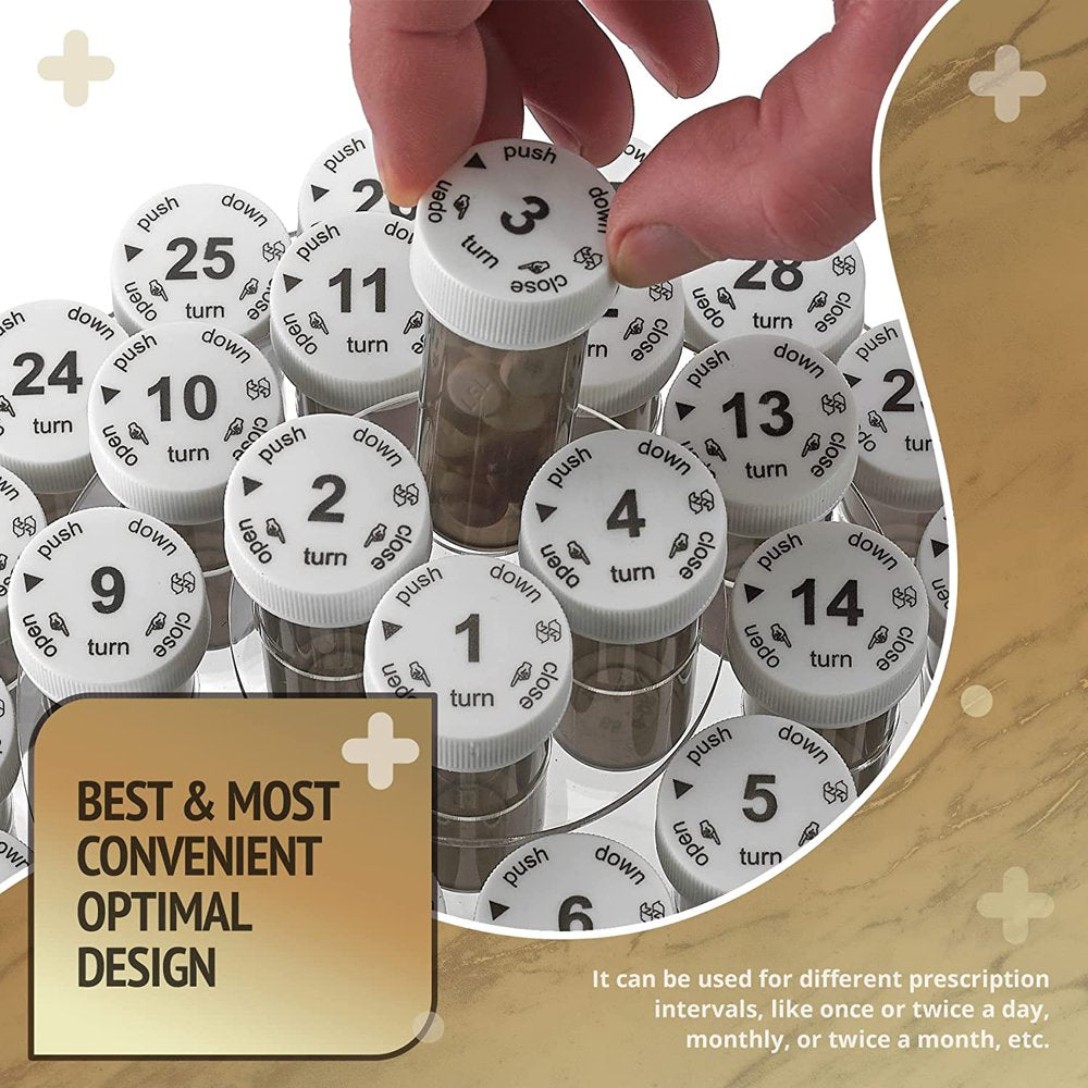 MEDca Monthly Pill Bottle Organizer Our medicine organizer has 31 labeled standard size pill bottle, 1 for each day of the month. You only need to schedule a day each month to sort out your medicine and fill each bottle for your month's supply and you're done. The pill bottles are housed in a circular container that has 3 tiers, keeping it neat, organized, and takes up minimal space on your counter. The bottles fit snugly in their slots, so they don't topple or fall in case of accidental bumps. The bottles have child-resistant lids preventing the contents from spilling out. The lids also protect your pills, tablets, and capsules from contaminants and moisture absorption that can affect their efficacy.