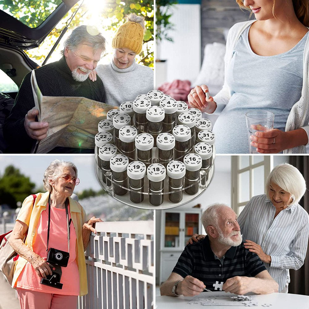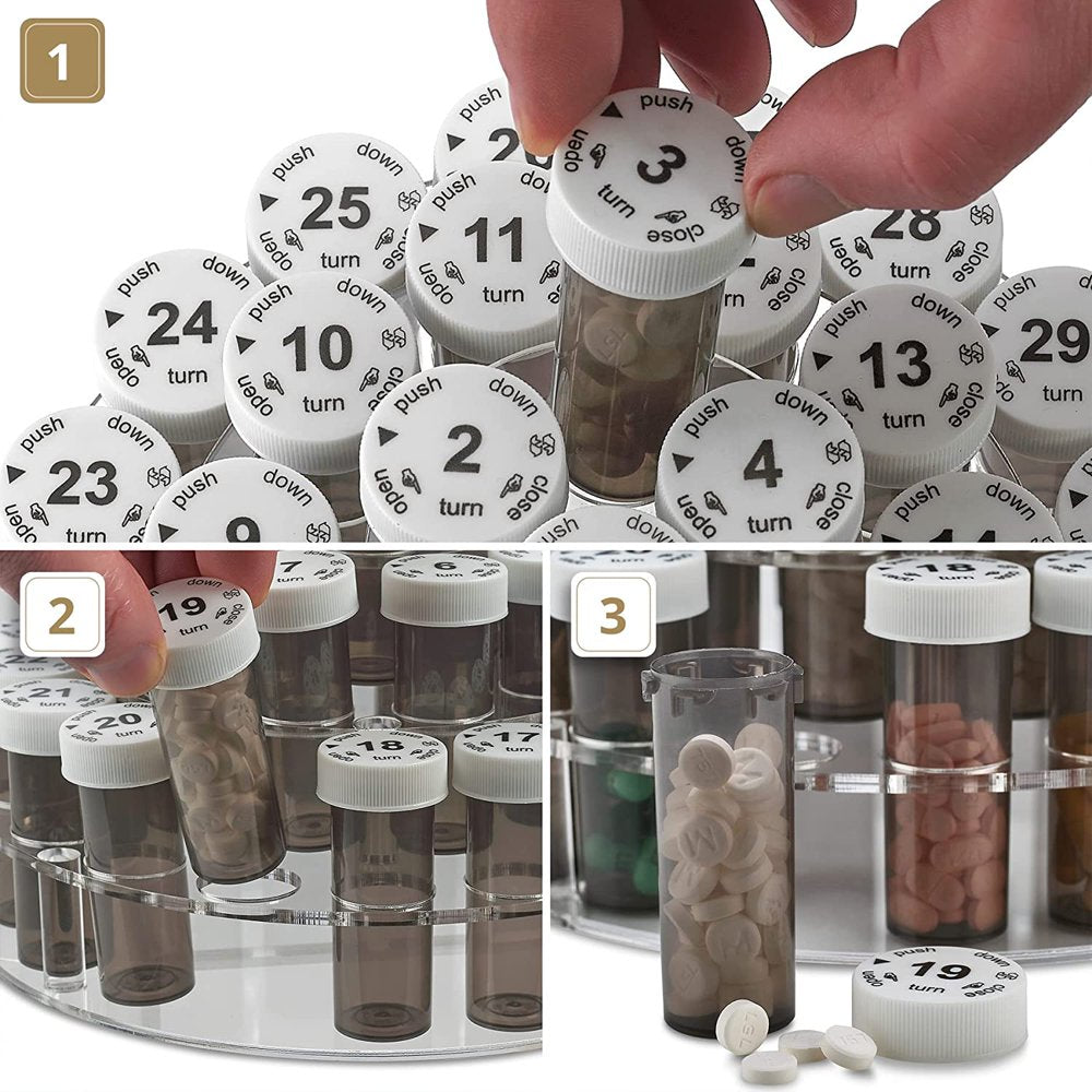- 3 TIERS. CHILD-PROOF LIDS: The pill bottles each have child-proof lids and are contained in a 3-tiered circular clear acrylic tray. You can arrange them starting at the top tier by placing bottles numbered 1-4. The middle tier with 5-14 and the rest at the bottom tier. The case itself has round slots where the bottles fit exactly, keeping them upright and prevents them from falling off. Takes up only a small space so it's ideal on a kitchen or bathroom counter.