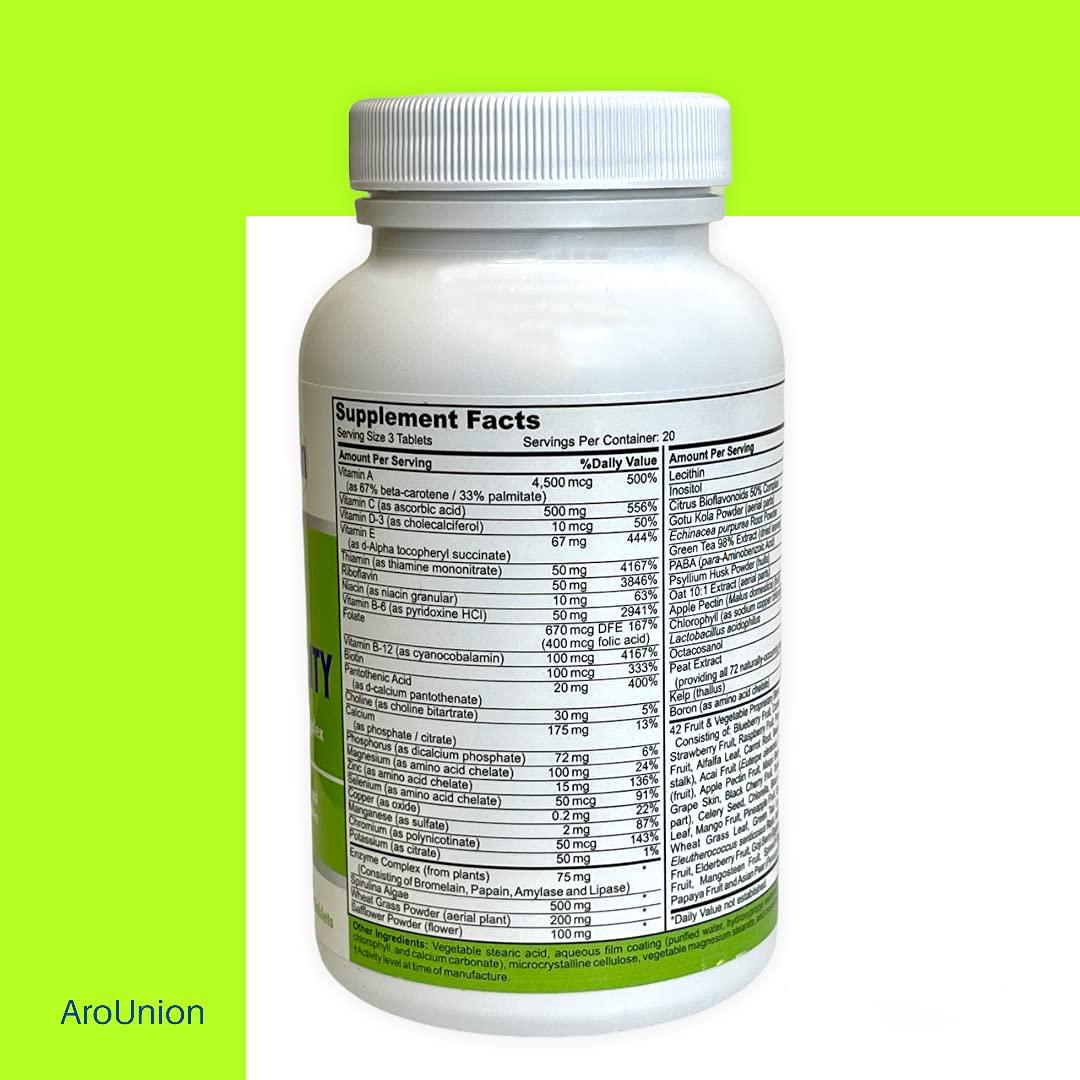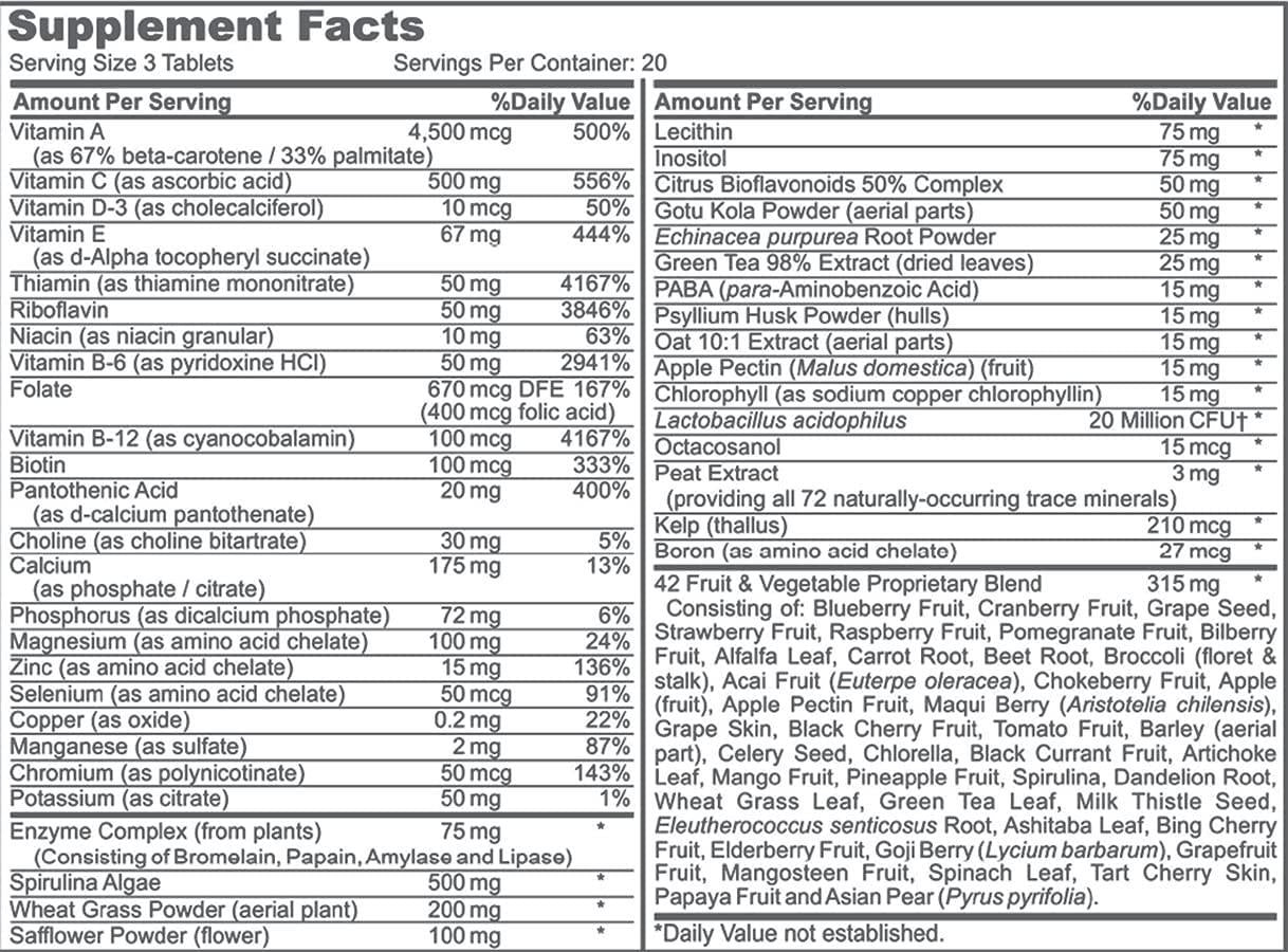 42 Fruit and Vegetable Proprietary Blend, a good source of Vitamin A, Vitamin C, Vitamin E, Vitamin D-3, Vitamin B-6, Vitamin B-12, Thiamin, Folic Acid, Biotin, Zinc and Spirulina Algae.