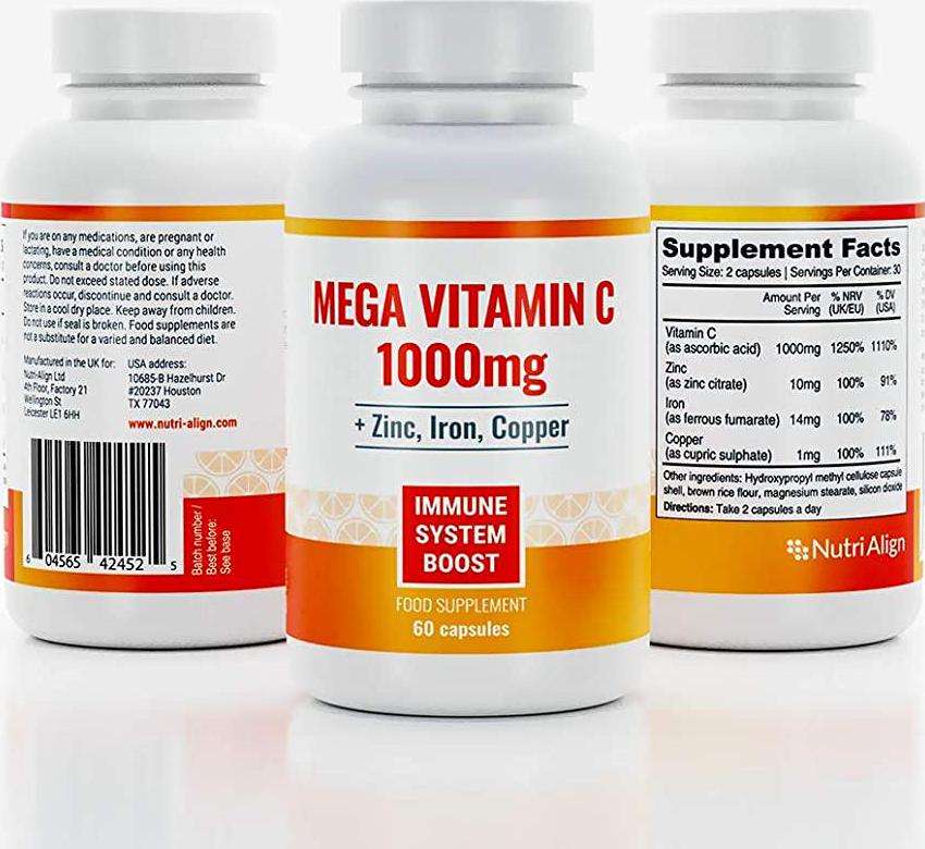 Mega Vitamin C 1000mg Plus Zinc, Iron and Copper. Powerful Immune System Boost. Sugar-Free, Gluten-Free. 60 Capsules - 1 Month Supply.
