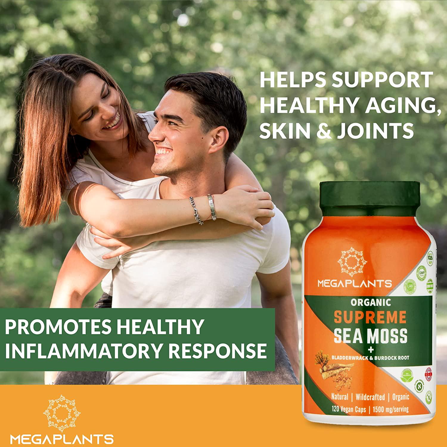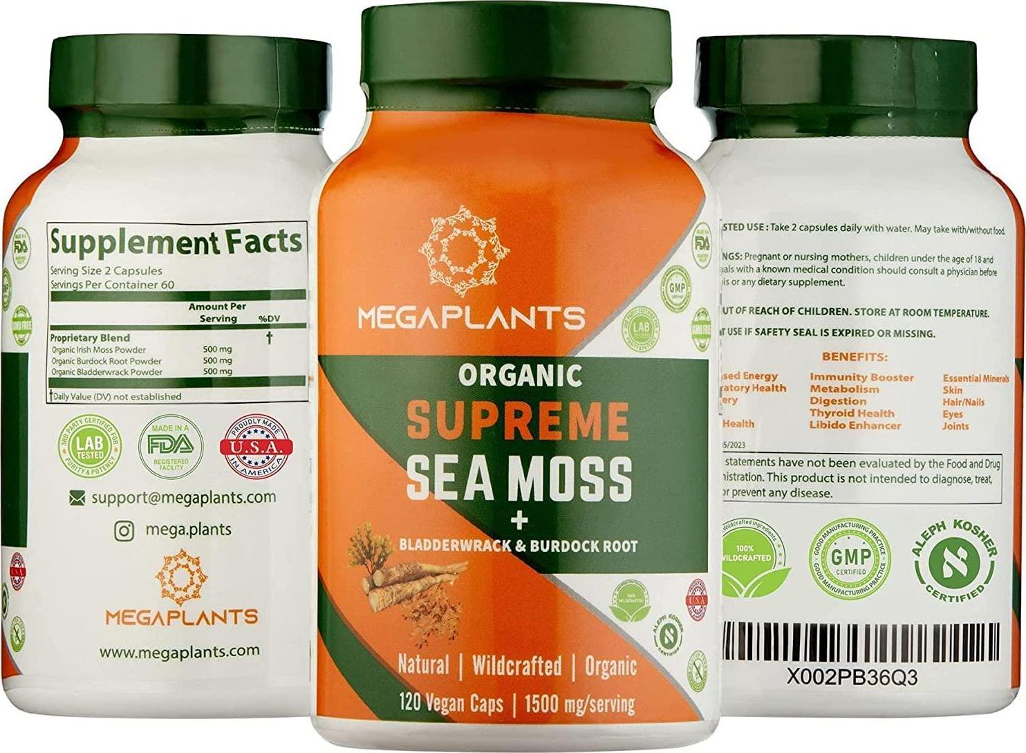 MegaPlants Supreme Sea Moss Bladderwrack Burdock Root | 120 Vegan Caps | 1500 MG/Serving | Certified Organic Ingredients | Wildcrafted | Non GMO | Essential Minerals | Energy + Immune Booster