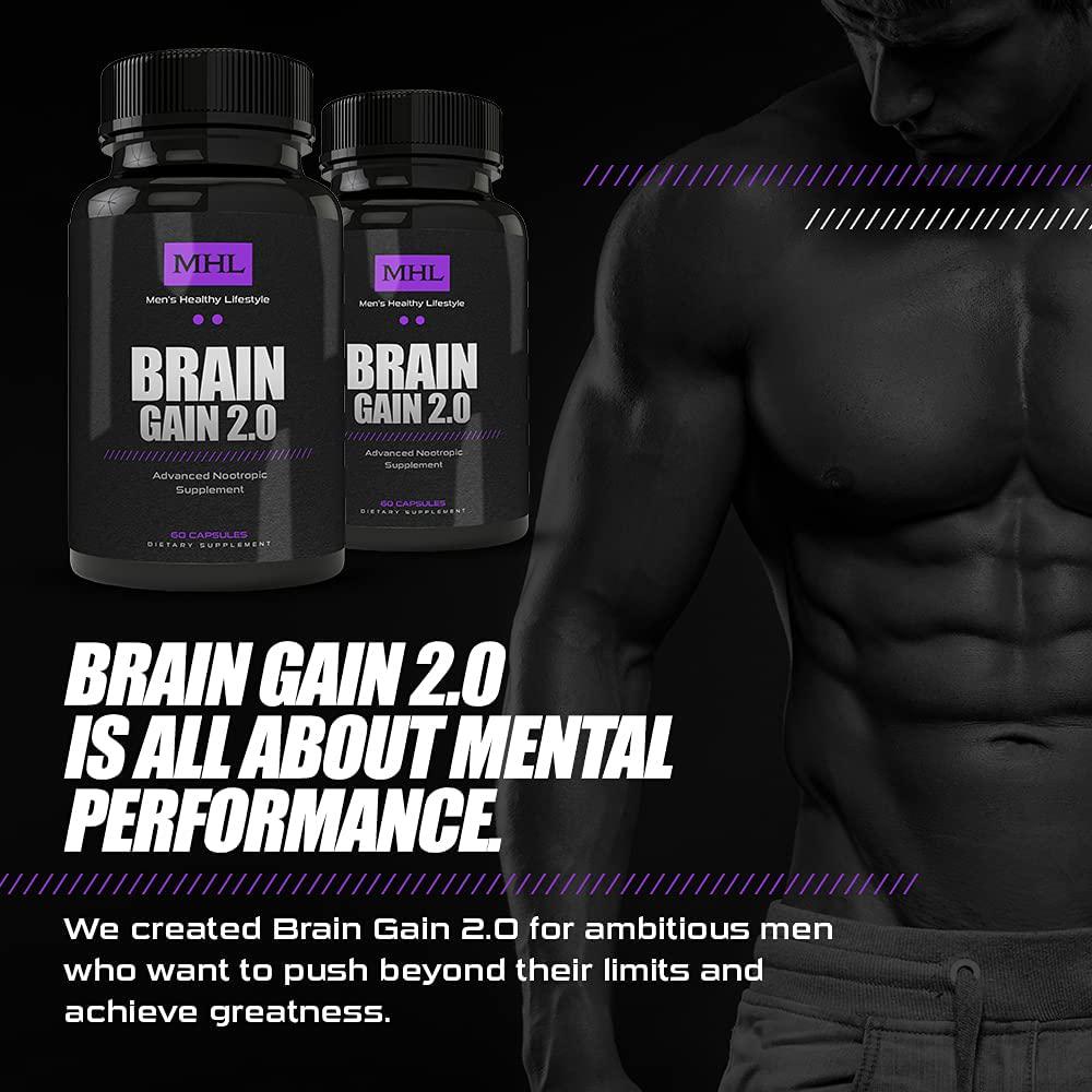 The Next Level of Mental Performance Brain Gain 2.0 is a revolutionary nootropic supplement for men, created by Mens Healthy Lifestyle to help men reach their peak mental health and performance through improved and optimized brain nutrition. The brain is among the most nutritionally demanding organs of the body, and not enough focus is put on brain health to optimize its performance. Brain Gain 2.0 gives you the ultimate advantage of having superior brain performance that leads to better focus, cognitive function, mental health, and productivity.