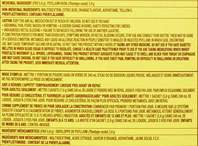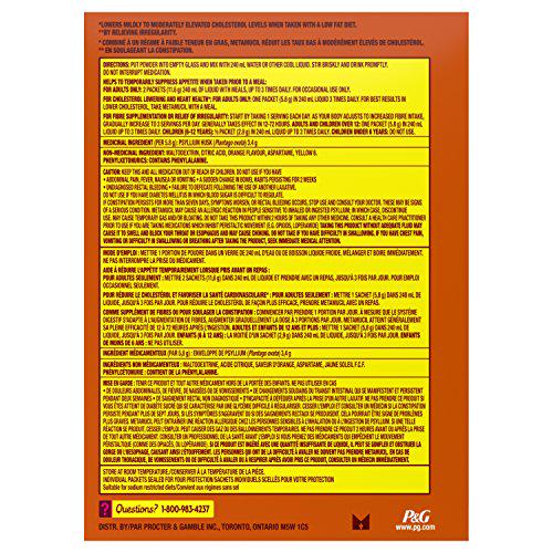 Metamucil with 100% naturally sourced psyllium fibre is a daily fibre supplement that promotes digestive health* and helps lower cholesterol levels to promote heart health** (*By relieving irregularity. **Lowers mildly to moderately elevated cholesterol levels when taken with a low fat diet. To ensure this product is right for you, always read and follow the label.) Safety Warning Choking: Taking this product without adequate fluid may cause it to swell and block your throat or esophagus and may cause choking. Do not take this product if you have difficulty in swallowing. If you experience chest pain, vomiting, or difficulty in swallowing or breathing after taking this product, seek immediate medical attention. Allergy alert: This product may cause allergic reaction in people sensitive to inhaled or ingested psyllium. Ask a doctor before use if you have: - A sudden change in bowel habits persisting for 2 weeks - Abdominal pain, nausea or vomiting Stop use and ask a doctor if: - Constipation last more than 7 days - Rectal bleeding occurs These may be signs of a serious condition. Keep out of reach of children. In case of overdose, get medical help or contact a Poison Control Center right away