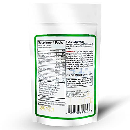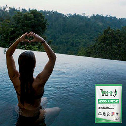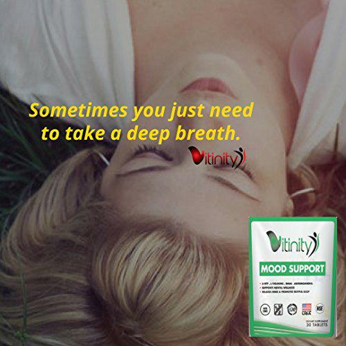 Mood Support - Natural Mood - Relax and Relief with 5-HTP and Chamomile - Improve Your Energy, Overall Wellbeing, and Sleep - Natural Serotonin and Dopamine Kick Starter (45 Tablets) MOOD BOOSTER: Mood Support is a natural supplement that offers a natural solution to relieve anxiety and stress and help improve your mood. Our formula is a collection of herbs that together to help you maintain a stable and positive mood. It contains ingredients passionflower, chamomile, and lemon balm. These help support the natural production of the chemicals serotonin, dopamine, and norepinephrine in the brain, which help to maintain a positive state of mind. ANTI STRESS and ANXIETY SUPPLEMENT: Our calming mood supplement has the ultimate blend of herbs that help increase the production of GABA, a key neurotransmitter that works to reduce restlessness and promote an overall calming effect. AYURVEDIC ADAPTOGENS: Ashwagandhas adaptogen properties help cope with daily stressors and promote relaxation. Our anti-anxiety formula helps support adrenal health and the bodys ability to handle fluctuating cortisol levels better. RESTFUL SLEEP: Our formula contains Ashwagandha and 5-HTP which can help achieve more restful sleep. You will get to sleep faster, sleep deeper, and wake up feeling refreshed and renewed. Ashwagandha has been shown to help improve sleep quality, and 5-HTP is a direct precursor to GABA - the neurotransmitter that provides that calming effect. DOCTOR FORMULATED: Vitinity Mood Support multi-vitamin is scientifically formulated by a doctor who picked the most effective ingredients to support a healthy serotonin balance in the brain, boost your mood, and promote calmness. Our mood support formula contains herbal ingredients that are backed by research showing the benefits of the numerous ingredients