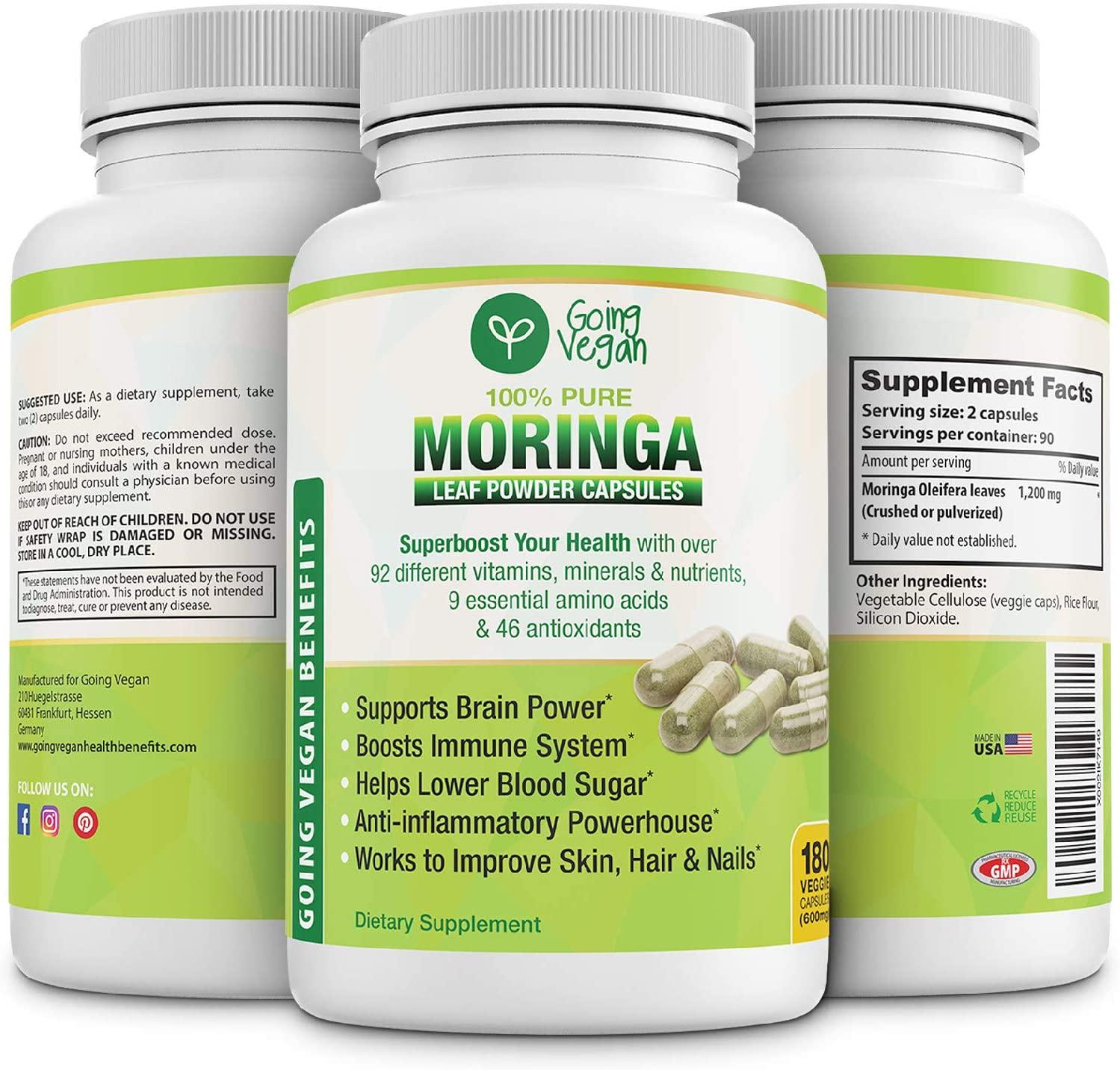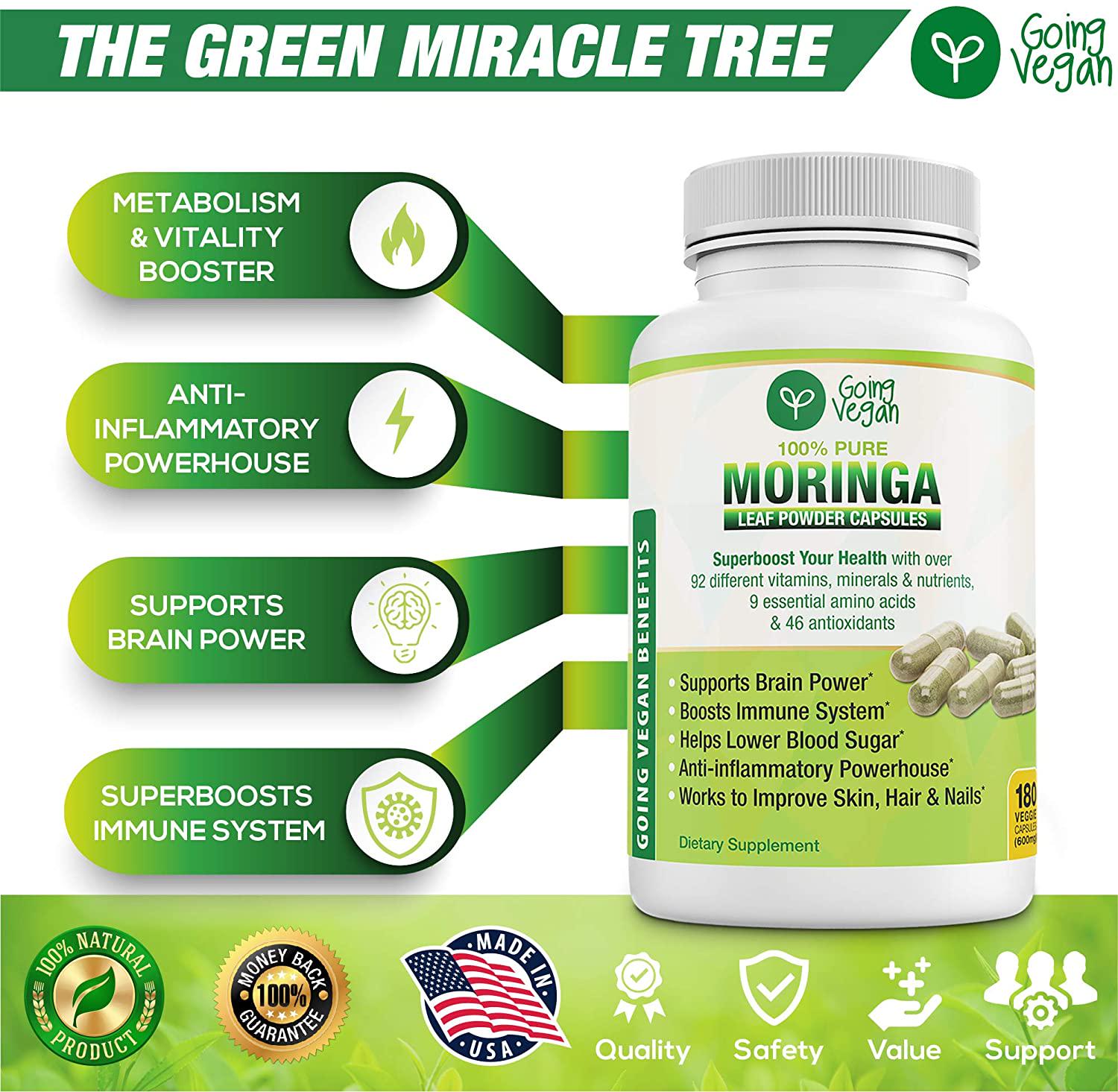 Moringa Capsules Organic Oleifera Leaf, 180 Vegan Powder Pills, 1200mg Per Serving, Anti-inflammatory Supplement, Immune System, Metabolism, Energy and Brain Booster, Non GMO