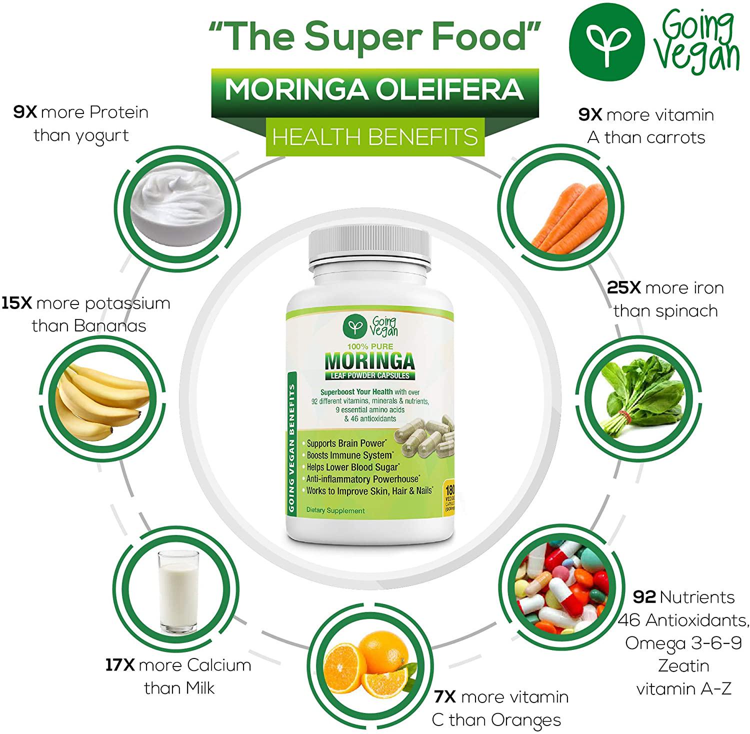 - KING OF ALL SUPERFOODS - The leaves are loaded with vitamins, minerals, essential amino acids, and more. Gram for gram, moringa leaf powder contains: 15X more potassium than bananas, 10X more vitamin A than carrots, 25X more iron than spinach, 17X more calcium than milk, 8X more magnesium than kale, 20X more vitamin E than tofu, 7X more vitamin C than oranges. Moringa is without the shadow of a doubt Mother Nature's most precious nutritional gift to provide perfect health!