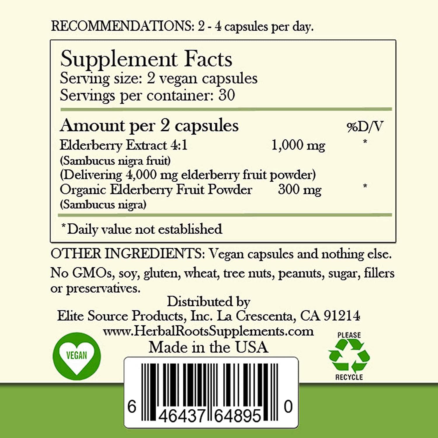 Our Black Elderberry capsules are made with organic elderberry powder and with a 4:1 extract equivalent to 4,300 mg pure elderberry per capsule. 60 count per bottle.