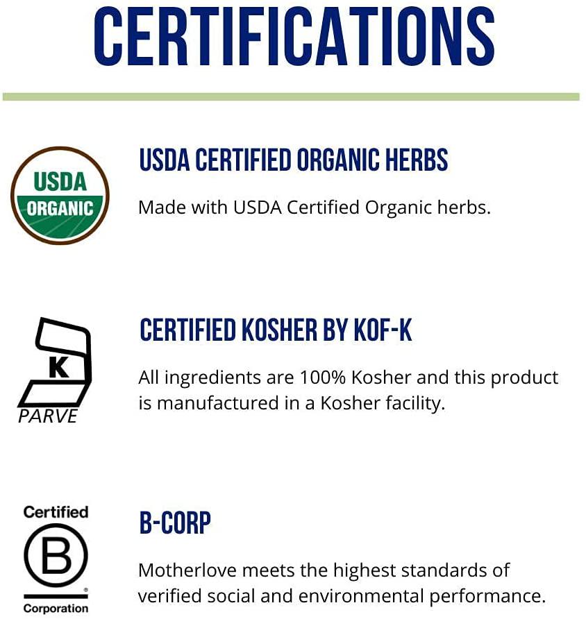 - MOTHERLOVE CARES: As a women-owned, family-run, Certified B Corp, Motherlove cares about people and planet over profit. This product is vegan, non-GMO, made with USDA Certified Organic herbs, and is packaged in a recyclable bottle. Manufactured in an NSF-registered GMP facility.