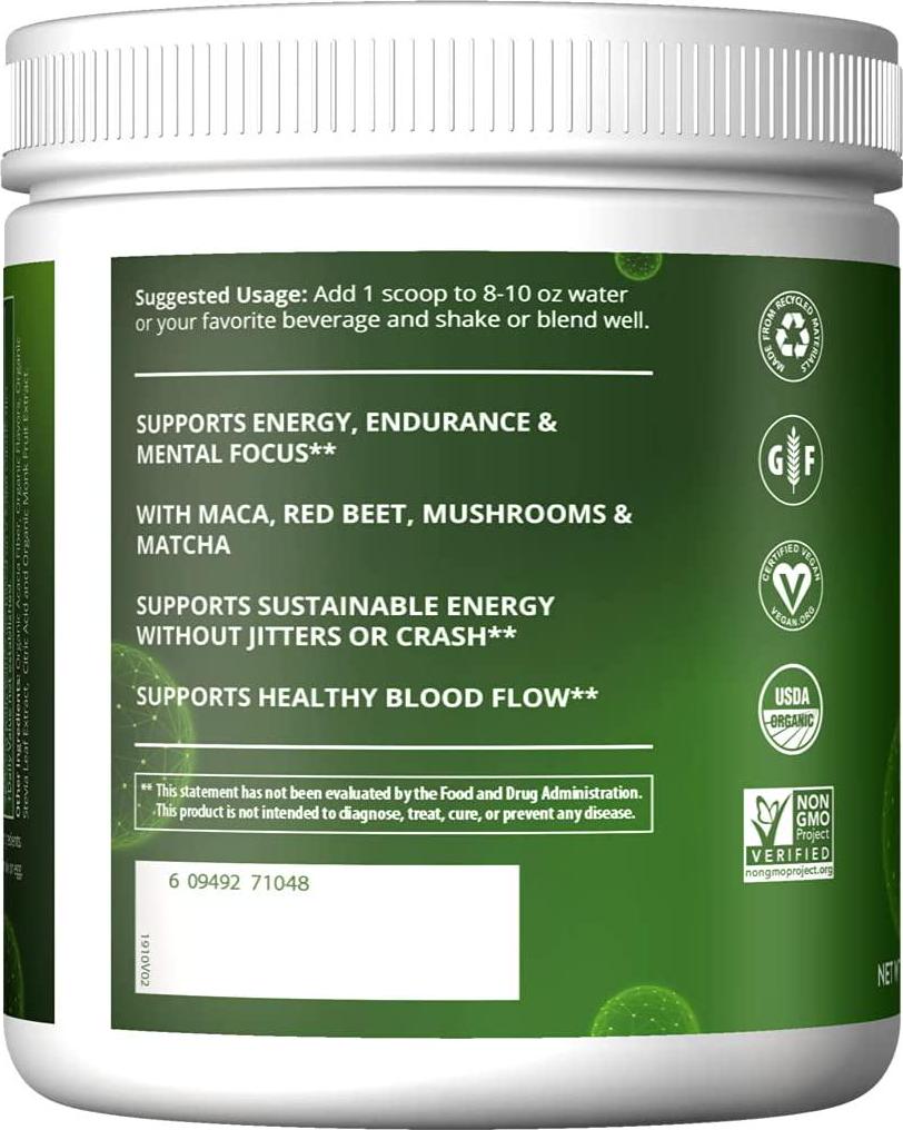 - ORGANIC ENERGY POWDER: This product is certified Vegan, Gluten-Free, Non-GMO and USDA organic. RECOMMENDATIONS: Drink 30-60 minutes before a workout.