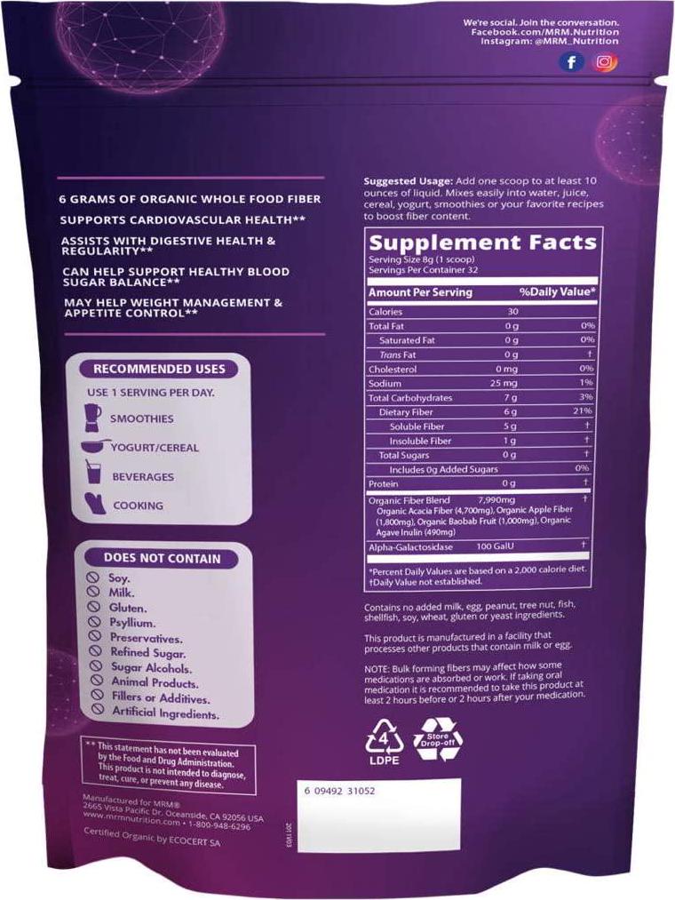 MRM Nutrition Whole Food Organic Fiber | with Enzymes + Prebiotics | Insoluble + Soluble fibers | Digestive Health + Regularity | 6g Fiber per Serving | 32 Servings