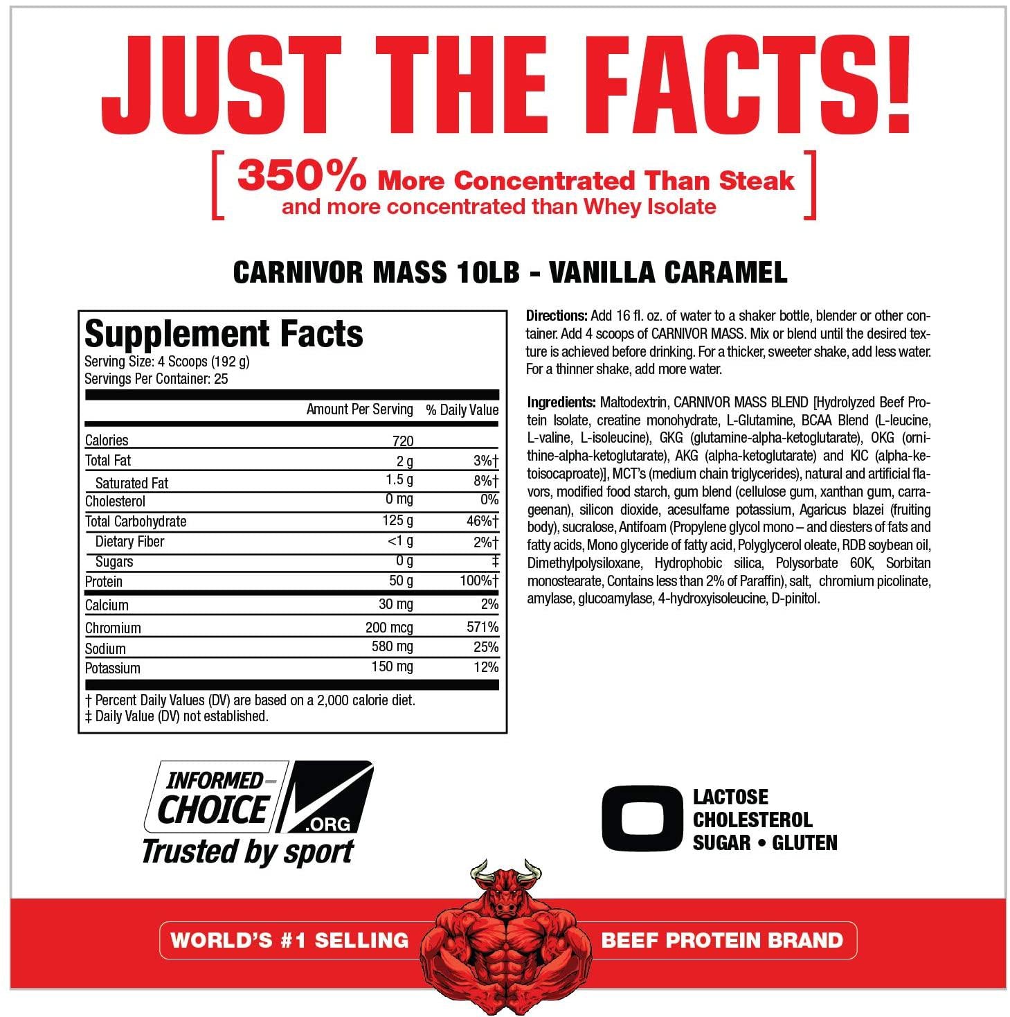 WHAT IS CARNIVOR MASS Carnivor Mass is fueled by 50g of beef protein isolate and over 700 calories, without any of the common allergens in other gainers including lactose, sugar, dairy, gluten. Plus Carnivor Mass is cholesterol free and low in fat. WHAT DOES CARNIVOR MASS DO? This highly anabolic beef protein is also hydrolyzed for rapid absorption, to support rapid muscle growth and recovery from your strenuous workouts. Beef up now with Carnivor Mass The Ultimate Weight Gainer! WHAT MAKES CARNIVOR MASS BETTER THAN OTHER PROTEINS? Customers who rely on traditional dairy protein based mass gainers often have suffered stomach distress due to the high contents of lactose, sugar, dairy, and even gluten, have switched over to Carnivor Mass, which is free of all these common food allergens.