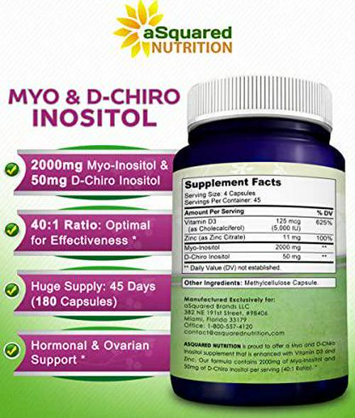 Myo-Inositol and D-Chiro Inositol Supplement - 180 Capsules - Plus Vitamin D3 and Zinc - Myo and D-Chiro Inositol 40 to 1 Ratio - VIT B8 Complex Pills aSquared Nutritions maximum strength Inositol formula contains 2000mg of Myo-Inositol and 50mg of D-Chiro Inositol per serving to create an optimal 40:1 ratio. With 180 capsules in each bottle, you receive a full 45-day supply. * HOW OUR PRODUCT COMPARES: · Huge Supply: 180 Capsules per Bottle · 45-Day Supply per Bottle · 2000mg of Myo-Inositol and 50mg of D-Chiro Inositol per Serving · Optimal 40:1 Myo to D-Chiro Ratio * · Enhanced with Vitamin D3 · Enhanced with Zinc to Support Immunity * · Formulated Right Here in the USA · Made in a GMP Certified Facility · Vegan Friendly, Non-GMO, No Preservatives BENEFITS OF OUR FORMULA: · Optimal 40:1 Myo to D-Chiro Ratio * · Supports Reproductive Health and Fertility * · Supports Hormonal Balance * · Supports Ovarian Health * · Menstrual Cycle Support * · Supports Immune System Health * · Contains Antioxidant Properties *