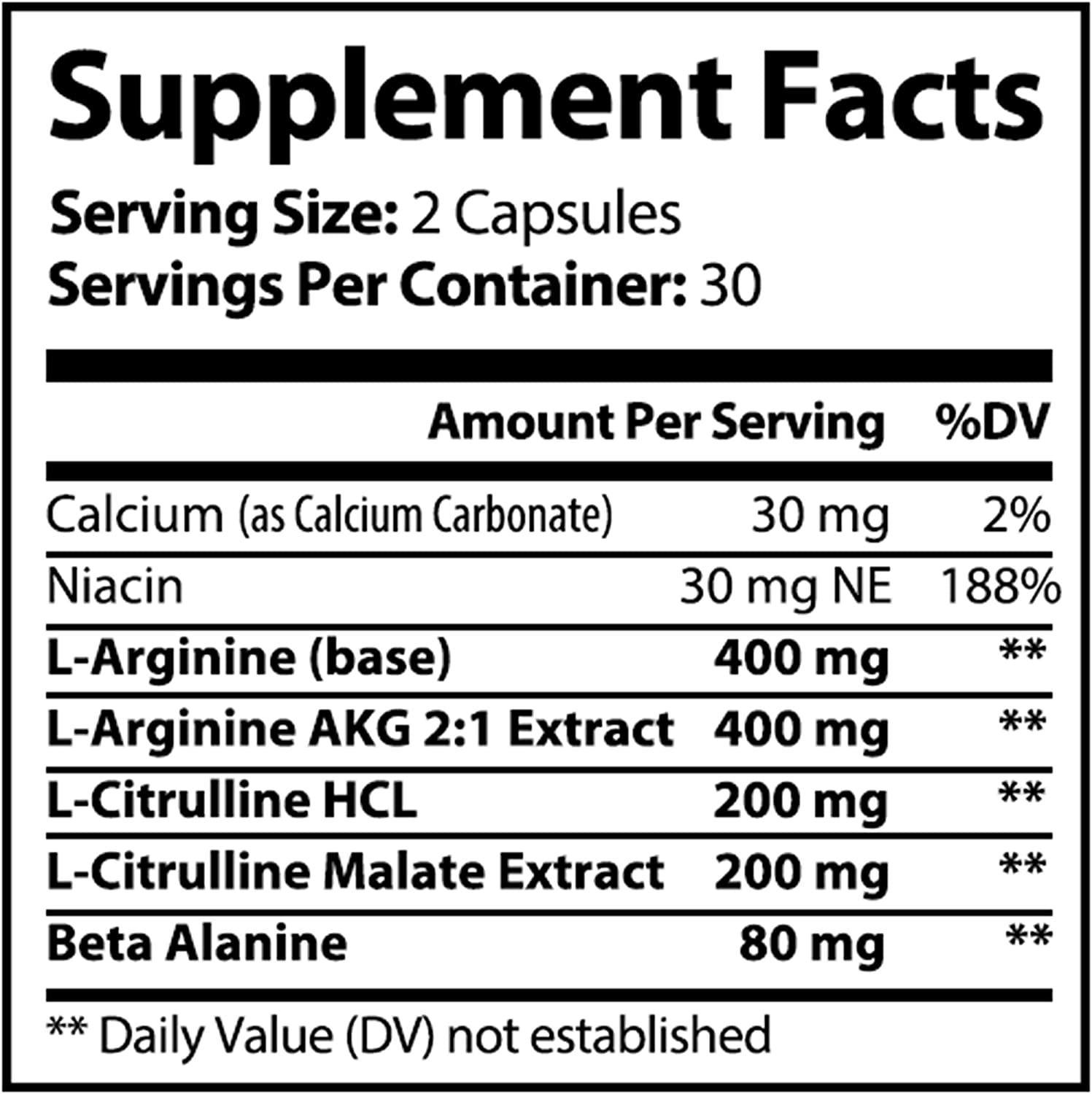- Ingredients: L-Arginine, AKG, L-Citrulline, L-Citrulline Malate Extract, Beta Alanine, Niacin, Calcium
