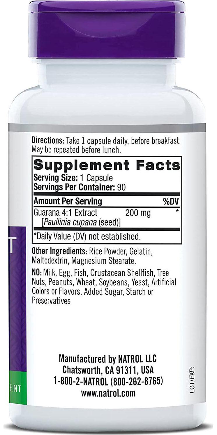 200mg capsules, energy support, gluten-free, guarana capsules, natrol guarana, unflavored, usa