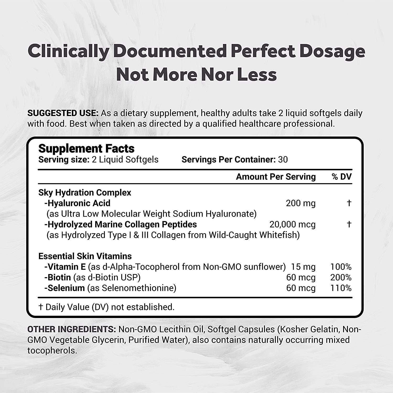 - MAX POTENT FORMULA: Delivering 200mg Hyaluronic Acid per serving with Marine Hydrolyzed Collagen Peptides, Biotin, Selenium and Natural Vitamin E for synergistic benefits.* 2 liquid softgels per day formula.