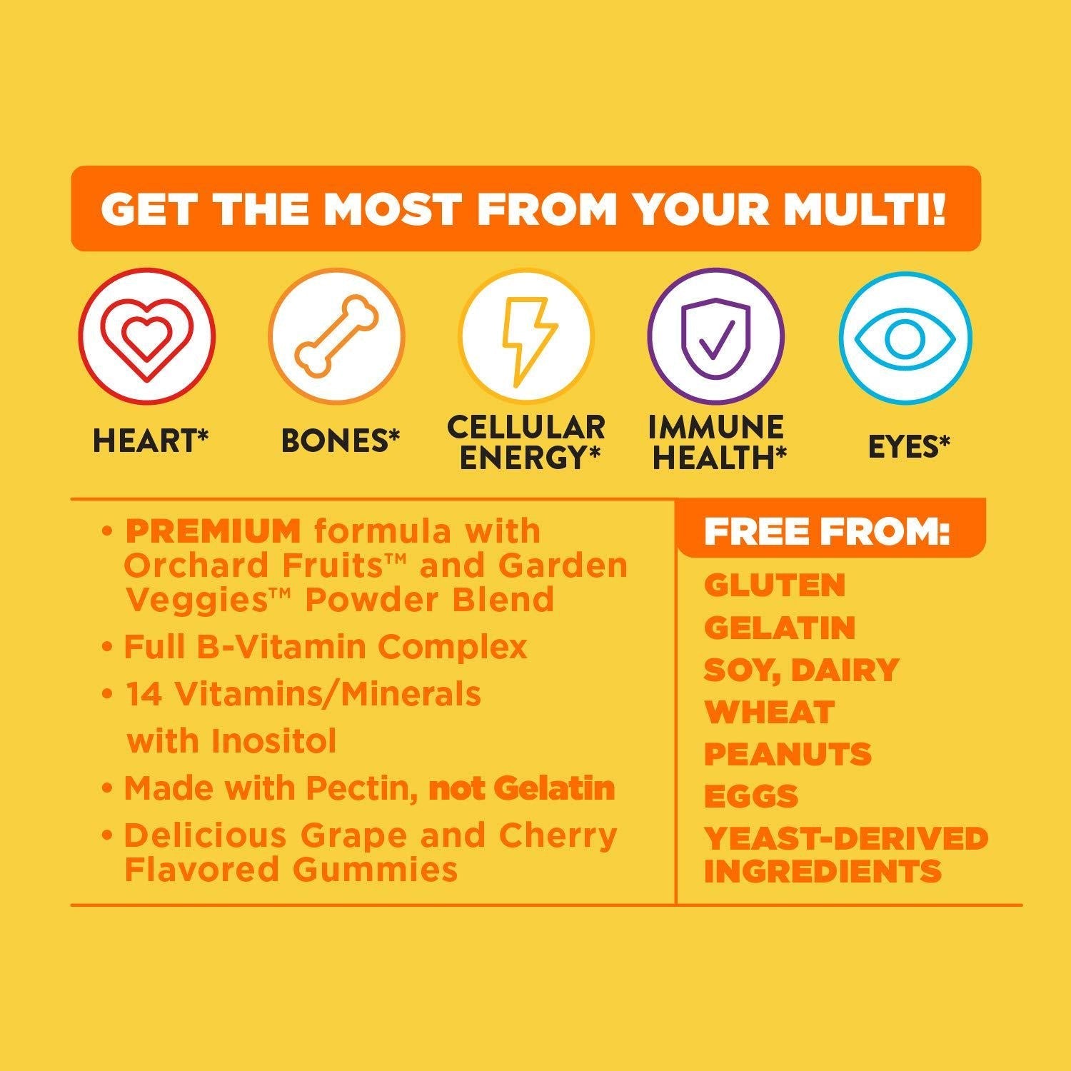 - With food-based Orchard Fruits & Garden Veggies powder blend (200 mg per serving).