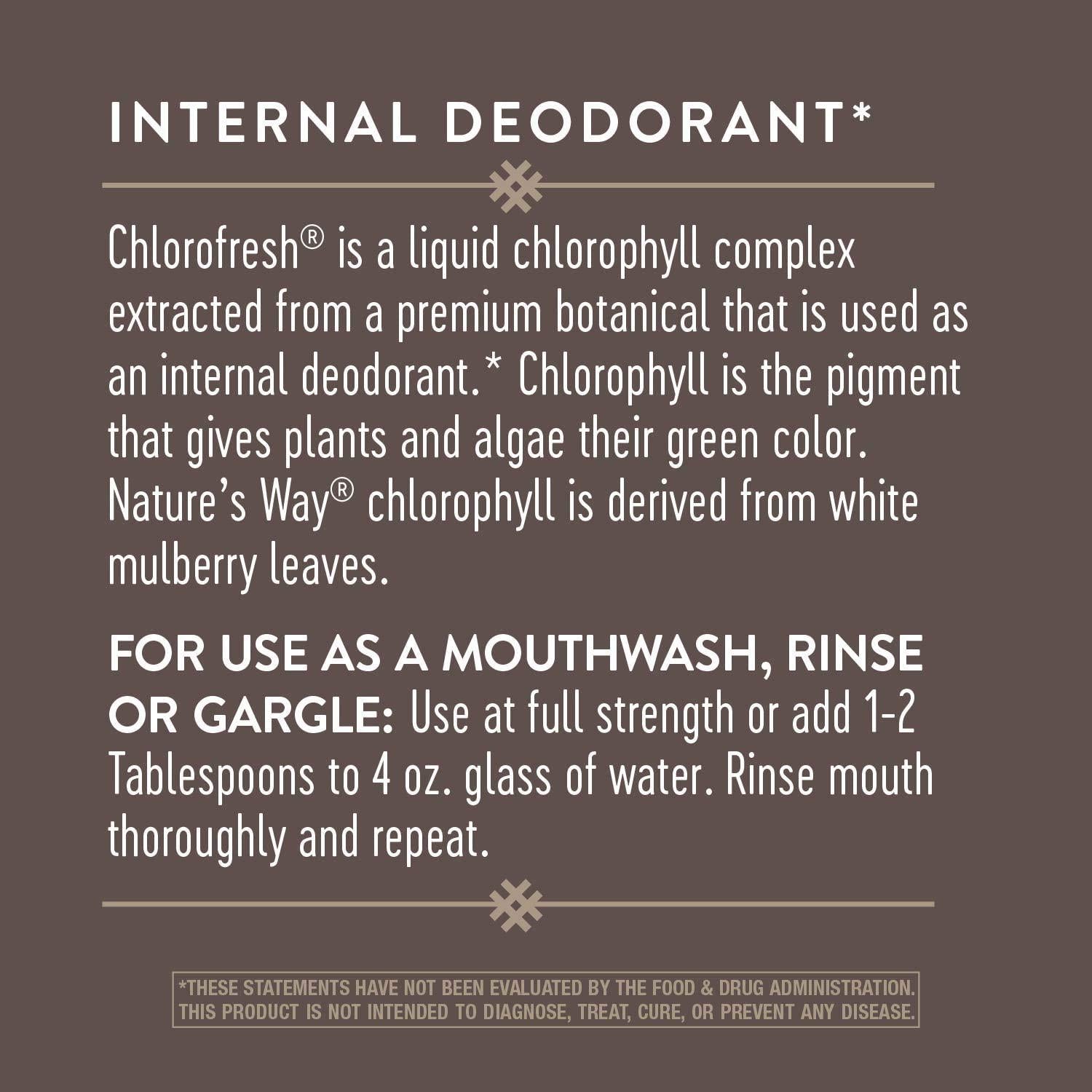 Chlorofresh is a liquid chlorophyll complex extracted from a premium botanical that is used as an internal deodorant.* Chlorophyll is the pigment that gives plants and algae their green color. Nature's Way chlorophyll is derived from white mulberry leaves.