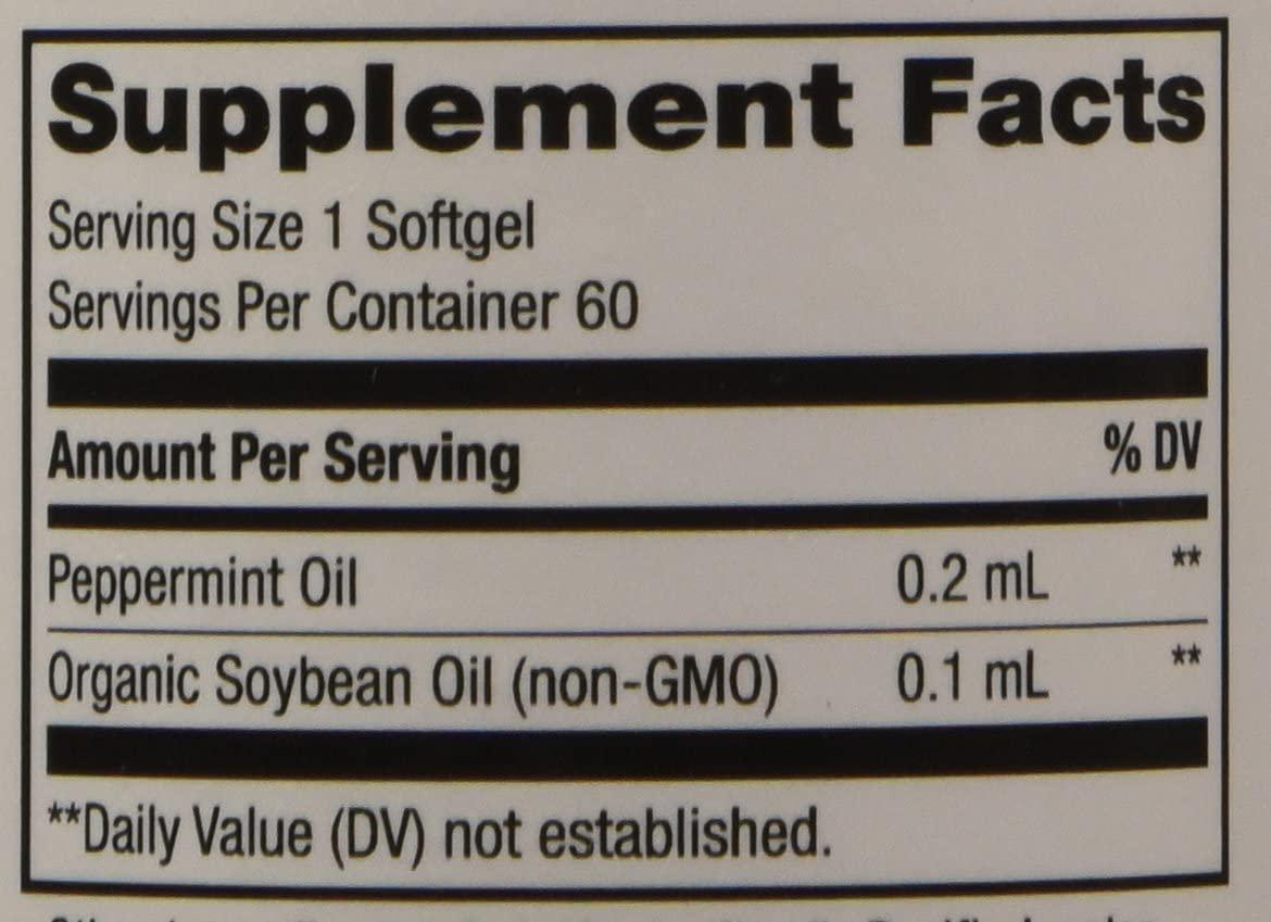 Size: 60 soft gelFor centuries peppermint oil has been traditionally used for gastrointestinal upset, cramps, gas and nausea. Today, modern science focuses on the menthol-rich essential oil found in peppermint leaves that soothes occasional disruptions in the bowel often caused by nervousness, overeating and/or changes in the diet. Natural relief for gastrointestinal upset, cramps, gas, nausea caused by nervousness, overeating and changes in the diet.Enteric coated to delay release until the oil reaches the lower bowelClinically proven dosage and competitively priced.Recommended Dose:Take one soft gel three times daily with water, 30 minutes to one hour before food.Supplement Facts:Serving size 1 softgel: Servings per container 60Peppermint Oil 0.2 ml Soybean Oil 0.1 ml