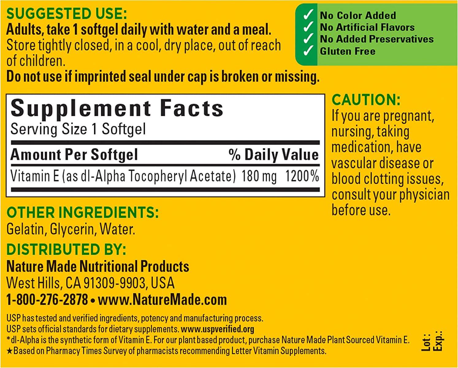• Contains a 180-day supply of Nature MadeVitamin E 180 mg (400 IU) dl-Alpha Softgels, 180 softgels per bottle.