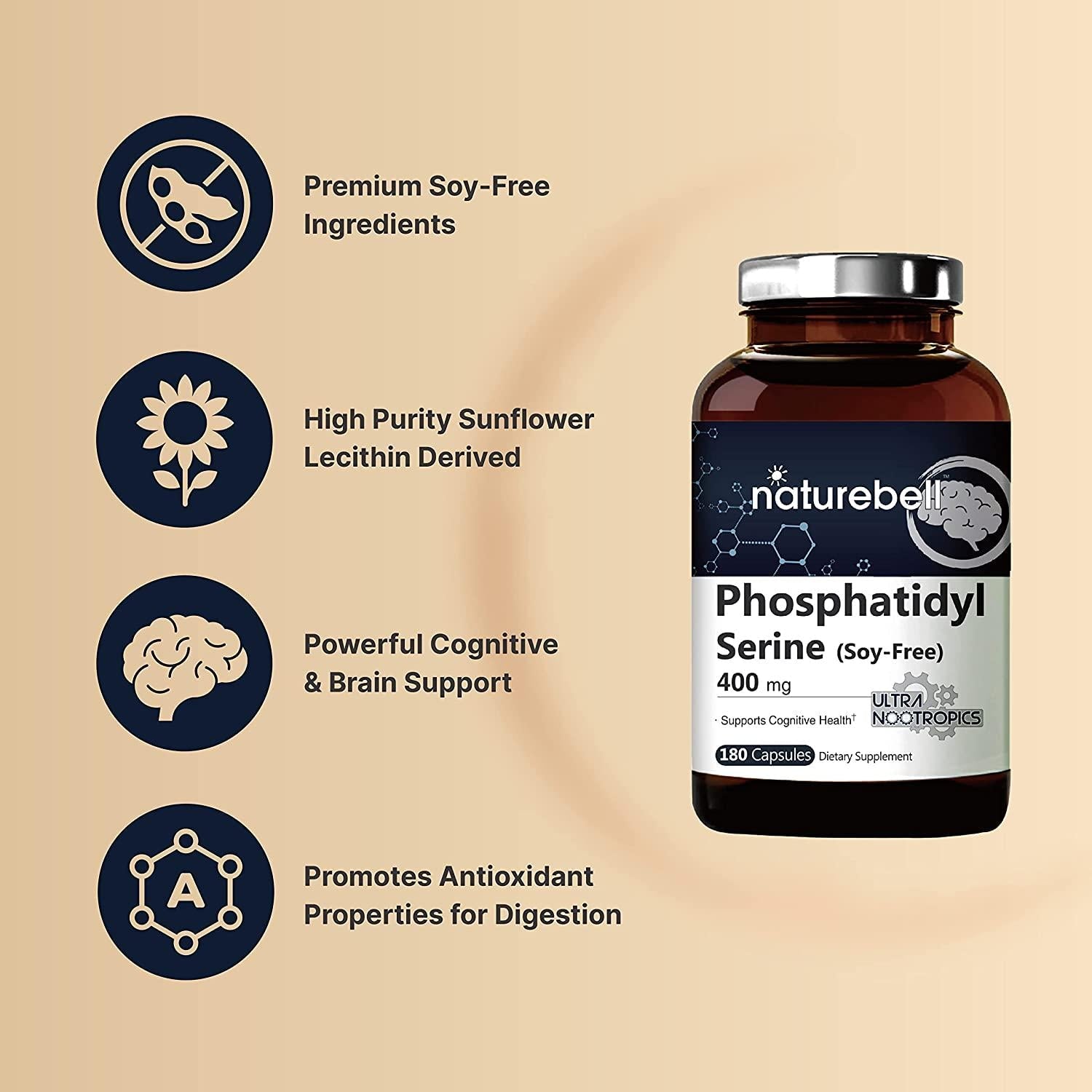 NatureBell PhosphatidylSerine 400mg Per Serving, 180 Capsules, No Soy, Made from Sunflower Lecithin, Strongly Supports Cognitive Health and Brain Function, No GMOs and Made in USA.