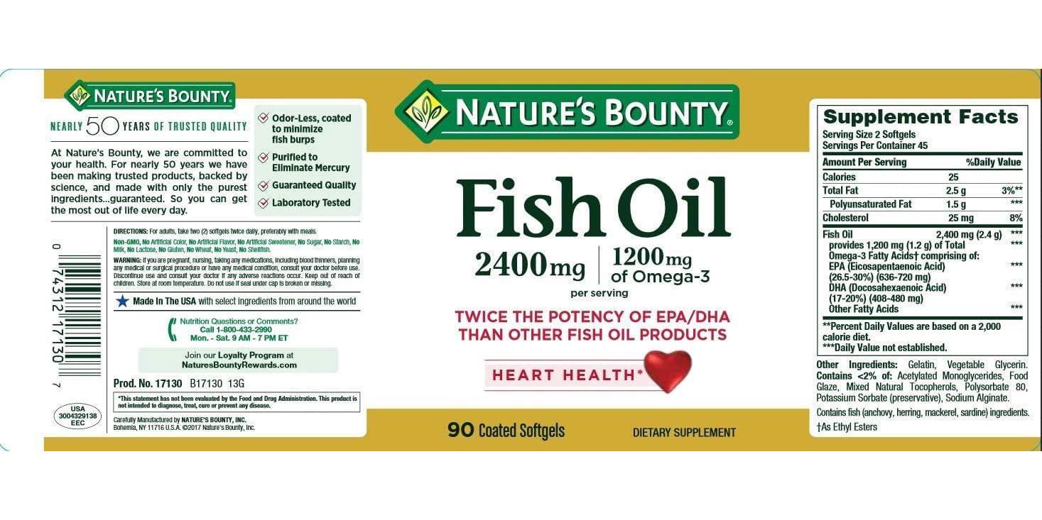 Nature's Bounty Fish Oil 2400 mg contains EPA and DHA, two Omega-3 fatty acids that help support and maintain the health of your cardiovascular system. Omega-3 fatty acids are considered good fats important for cellular, heart and metabolic health and help maintain triglyceride levels already within a normal range.
