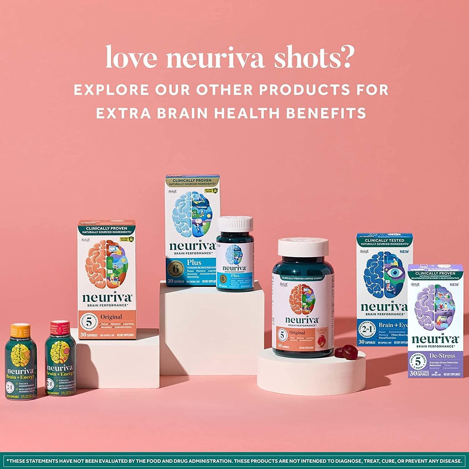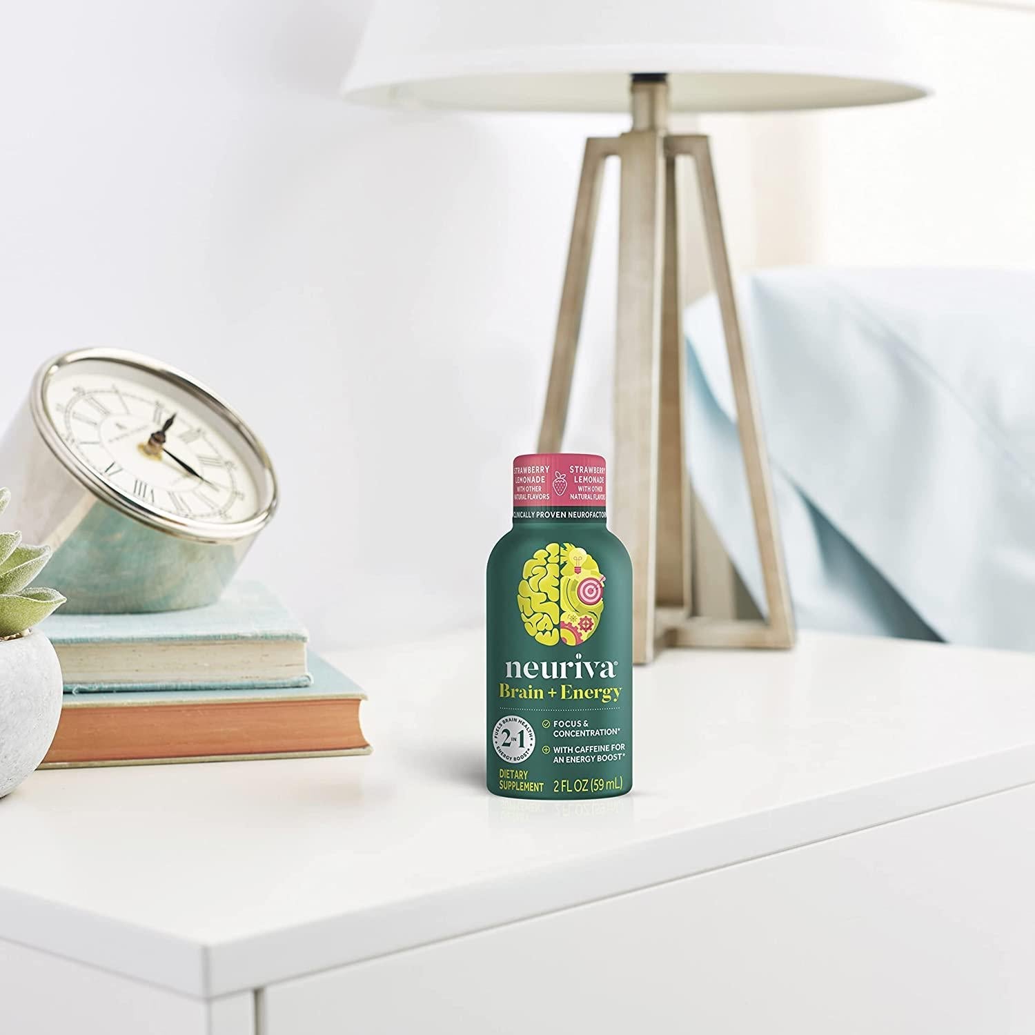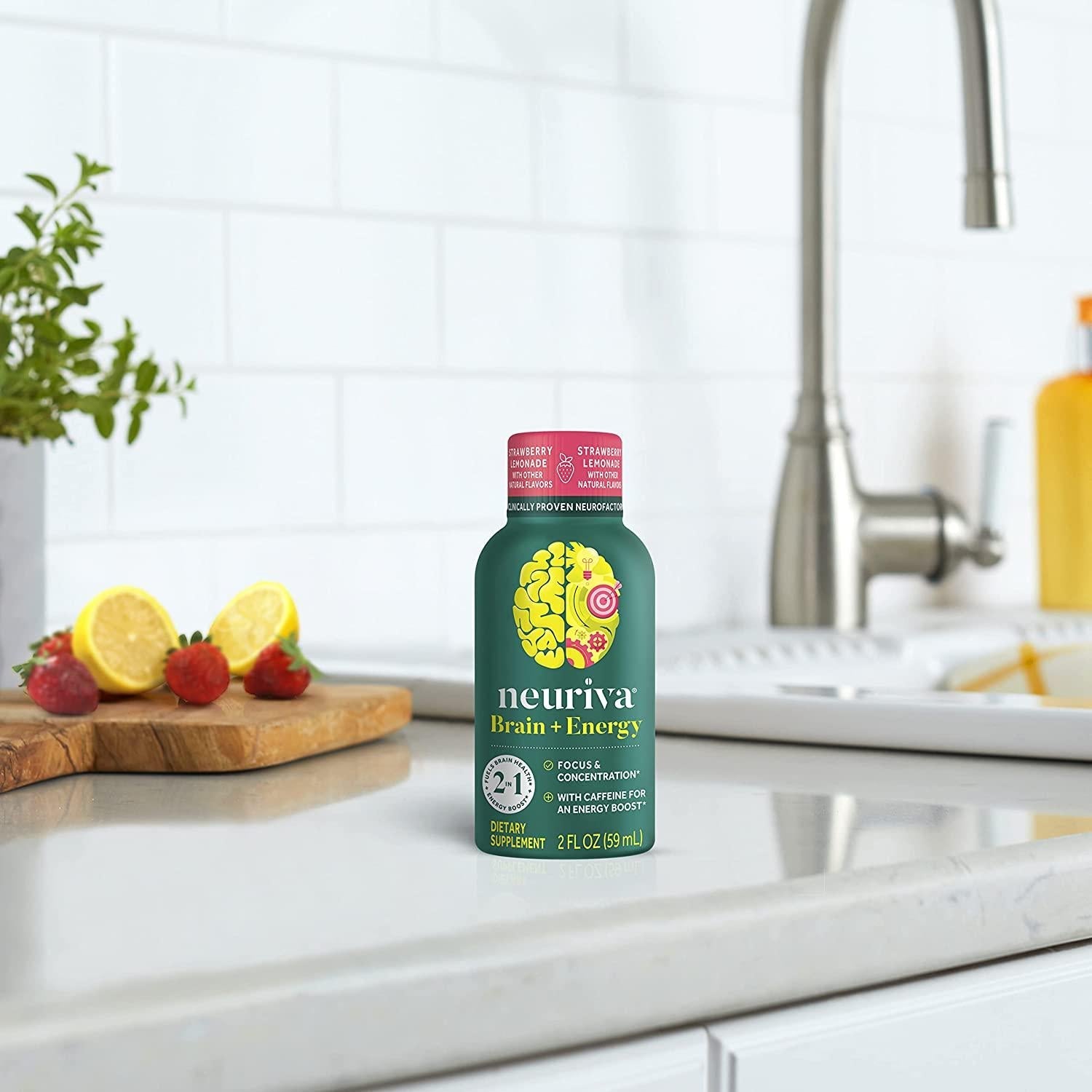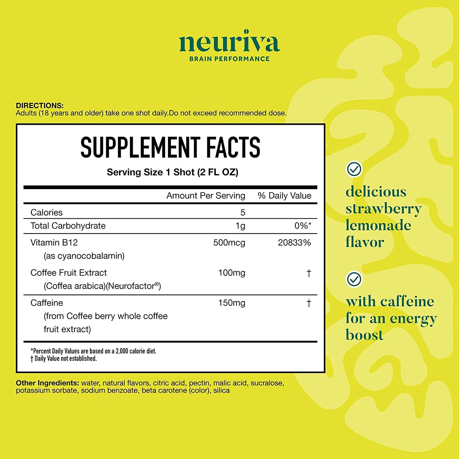When you take Neuriva Brain + Energy Ready-to-Drink Shots, they fuel Brain Health (Focus, Concentration) plus give you an Energy Boost (contains Caffeine for an energy boost), all in a delicious Ready-To-Drink Strawberry Lemonade flavored shot.* Made with naturally sourced & clinically proven Neurofactor. Neurofactor comes from the nutrient-rich fruit of the coffee cherry. This whole fruit extract is clinically tested to increase levels of the vital protein BDNF. BDNF is short for brain-derived neurotrophic factor. This protein (which is found in the brain) has been known to strengthen connections between brain cells.* Get Braining! Download our NEURIVA BRAIN GYM app from the App Store or Google Play to start assessing your skills and building your brain fitness routine. Our App has been recently updated with a soothing spa section to help calm the mind.Because when your brain wins, you win!THESE STATEMENTS HAVE NOT BEEN EVALUATED BY THE FOOD AND DRUG ADMINISTRATION. THIS PRODUCT IS NOT INTENDED TO DIAGNOSE, TREAT, CURE OR PREVENT ANY DISEASE.