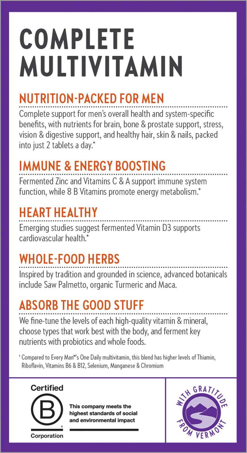If you're looking for the right multivitamin for men, it's helpful to know there are differences between raw, USP multivitamins, gummy vitamins, and whole-food fermented multivitamins New Chapter's Every Man. Our whole-food fermented men’s multivitamin is made with quality ingredients you can trust—way more than just isolated nutrients, and free from the animal gelatin and sweeteners of gummies. Our unique multivitamin is fermented with probiotics and expertly formulated to deliver bone and heart support with Vitamin D3, energy support with B Vitamins including Biotin, immune support, and stress support for men's daily wellness.* New Chapter multivitamins are gentle enough to take anytime—even on an empty stomach.