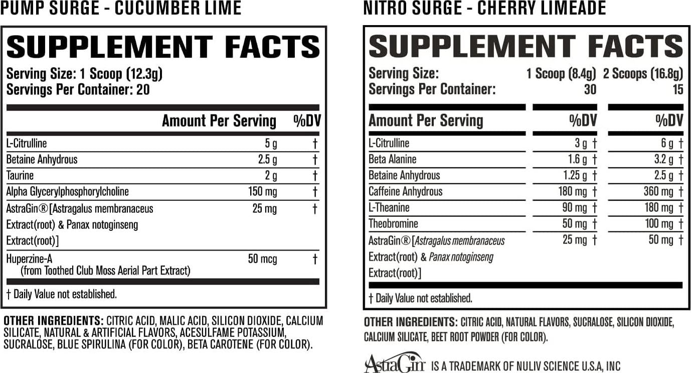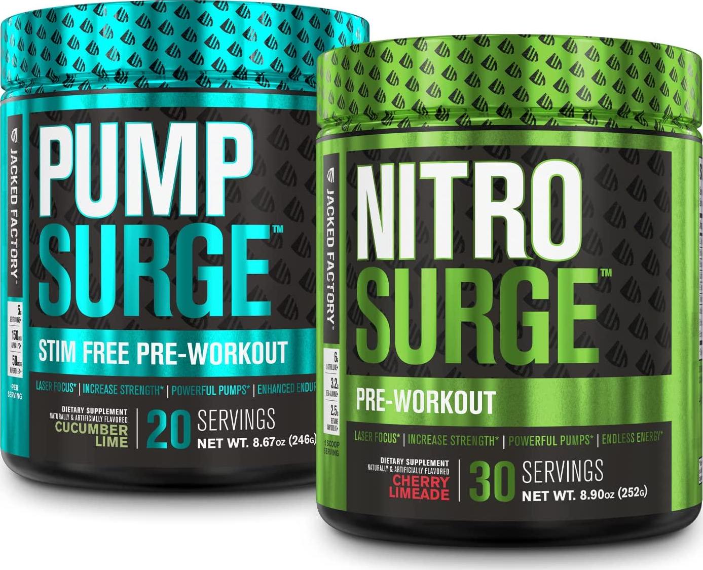- The Perfect Morning & Night Bundle: Power through your workouts no matter what time of the day. Nitrosurge contains stimulants caffeine while Pumpsurge is stimulant-free so you can get a late night pump in and still catch some much needed sleep.