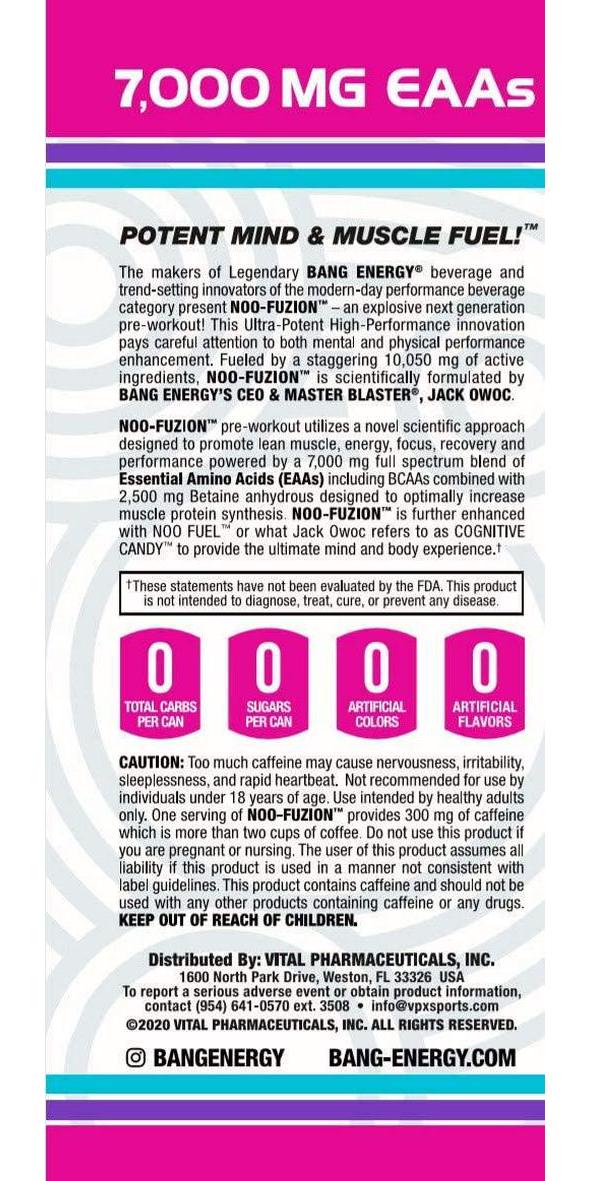 The makers of the legendary Bang energy beverages and trendsetting innovators of the modern-day performance-beverage category present NOO FUZION an explosive next-generation pre-workout! This ultra-potent, high-performance drink focuses on both mental and physical performance enhancement. Fueled by a staggering 10,500 mg of active ingredients, NOO FUZION is scientifically formulated by Bang Energys CEO & Master Blaster Jack Owoc. NOO FUZION Pre-Workout utilizes a novel scientific approach designed to promote lean muscle growth, energy, focus, recovery and performance. Powered by a 7,000 mg full-spectrum blend of essential amino acids (EAAs), including BCAAs, along with 2,500 mg of betaine anhydrous, NOO FUZION is designed to optimally increase muscle protein synthesis. But the real secret behind the awesome power of NOO FUZION is NOO FUEL what Owoc calls COGNITIVE CANDY which provides the ultimate mind and body experience! So, the next time you head to the gym, go for a jog or stay up all night gaming or studying for that big exam, pick up a NOO FUZION for that extra boost you need!