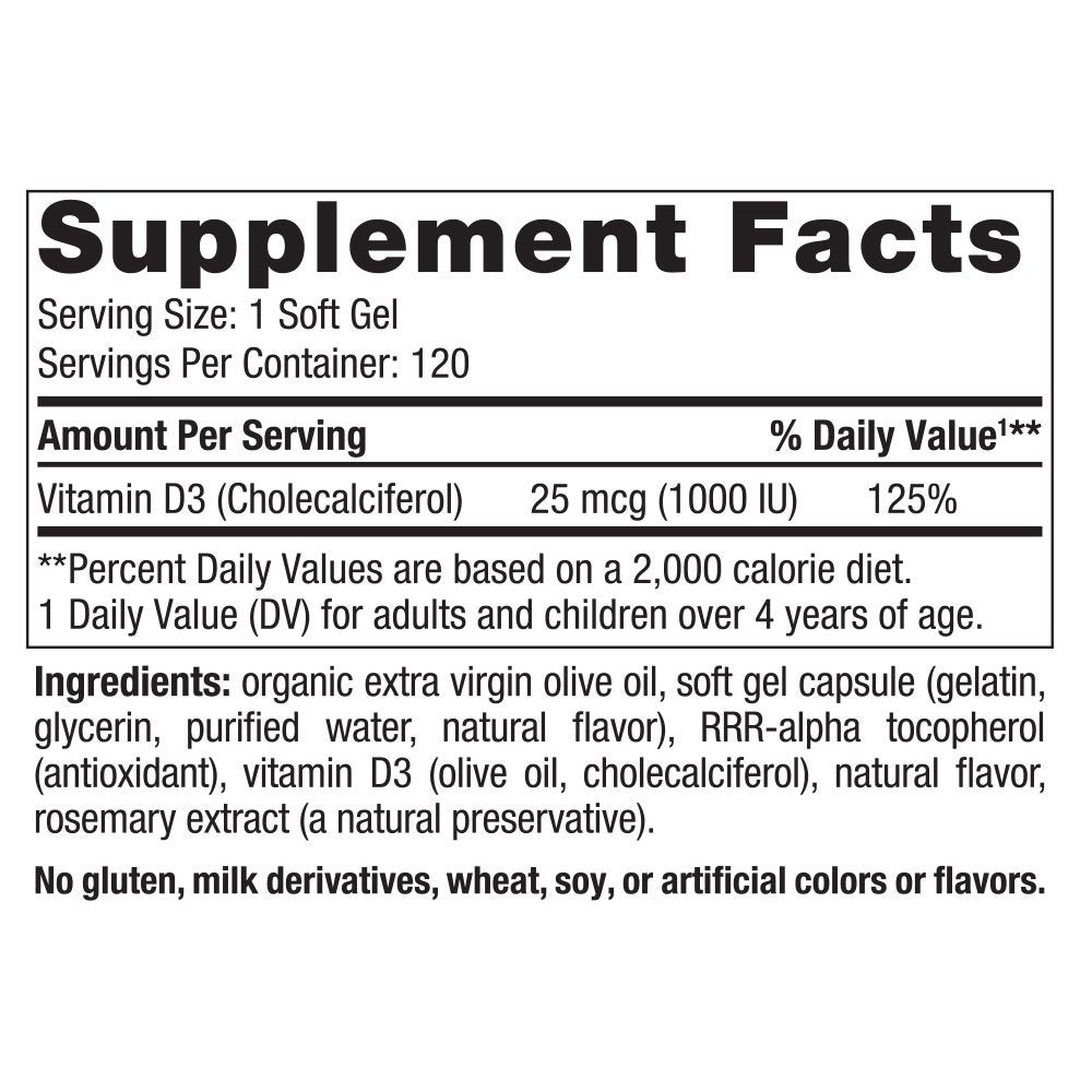 Just one serving of Nordic Naturals Nordic Vitamin D3 meets the daily recommended amount of vitamin D. Each soft gel delivers 25 mcg (1000 IU) of natural vitamin D3 in organic extra virgin olive oil. Research suggests that monounsaturated fats high in the omega-9, oleic acid, like extra virgin olive oil, have many powerful health benefits and promote cardiovascular health.* This product does not contain fish oil.
