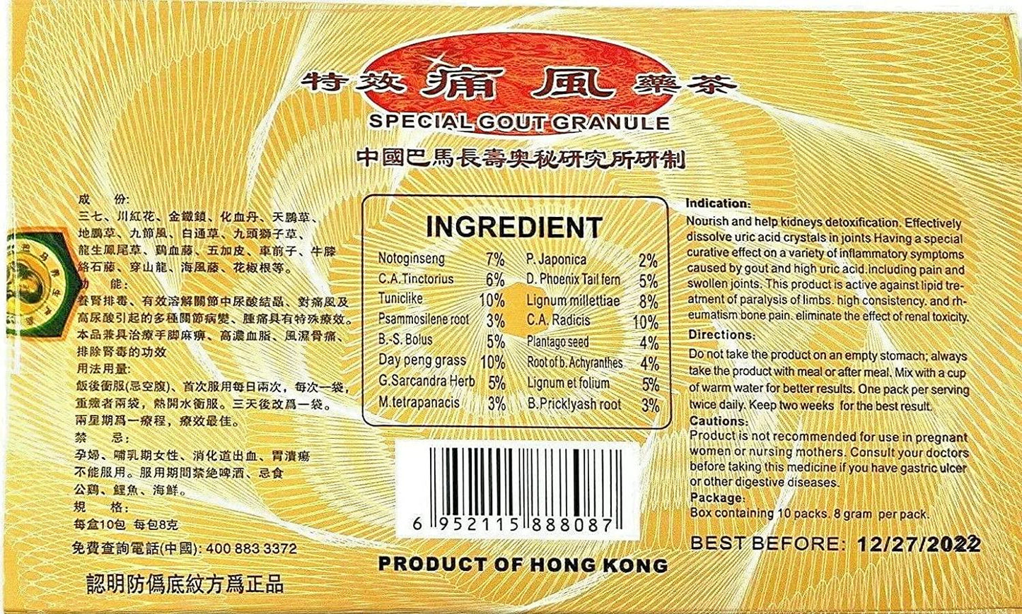 Nourish and help kidneys detoxification. Effectively dissolve uric acid crystals in joints having a special effect on a variety of inflammatory symptoms caused by gout and high Uric acid including pain and swollen joints. This statement has not been evaluated by the Food and Drug Administration. This product is not intended to diagnose, treat, cure or prevent any disease. DIRECTIONS Do not take product on empty stomach Always take with food or meal Mix with a cup of warm water for better results. Take one pack per serving twice daily. Caution Product is not recommended for use in pregnant or nursing mothers. Consult your doctor before taking if you have gastric ulcer or other digestive issues.
