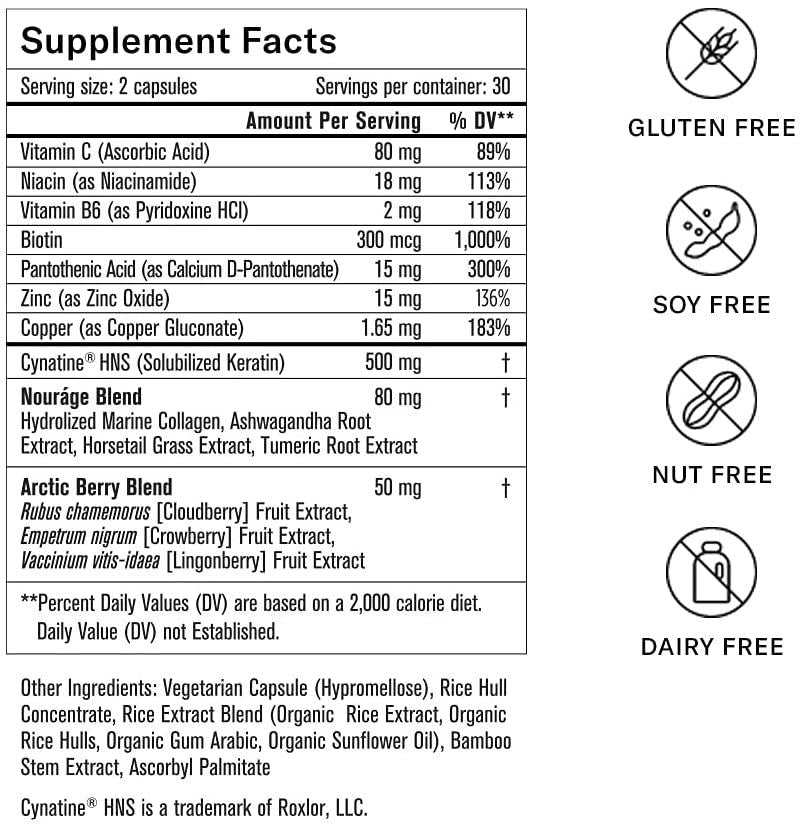 - NATURAL ADVANCED FORMULA: Our formula is all-natural, gluten-free, and non-GMO. It works a multivitamin to encourage hair growth, without any drugs or side effects. Nouráge contains an elderberry ingredient that may give off a berry aroma.