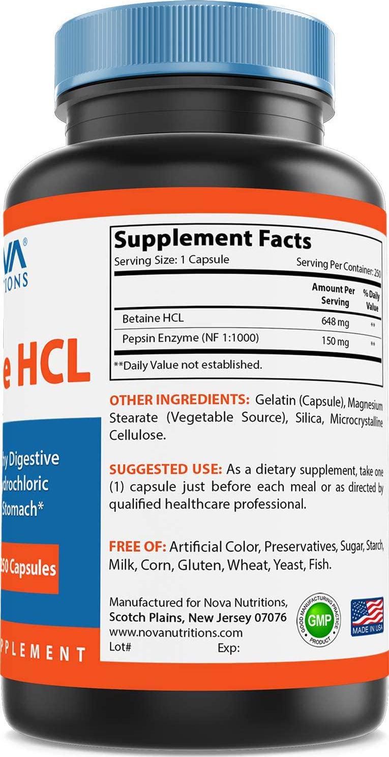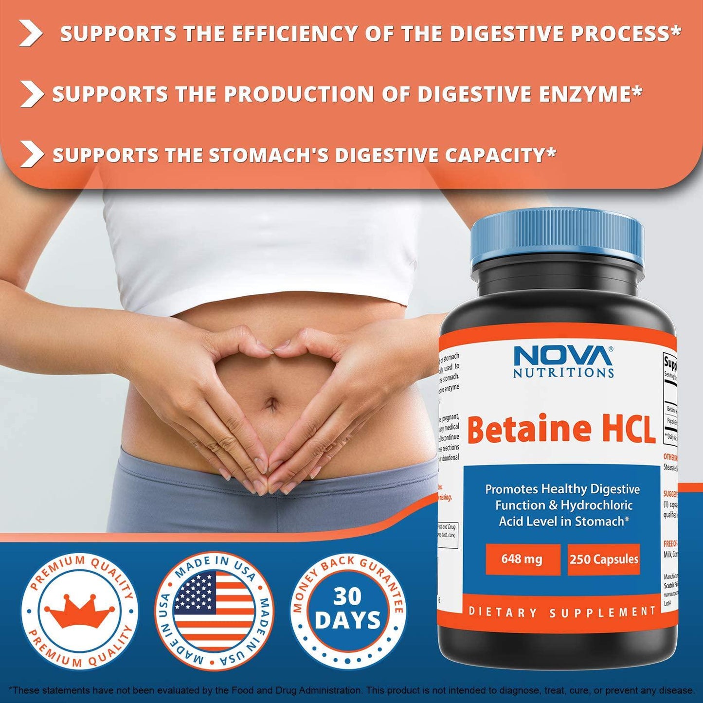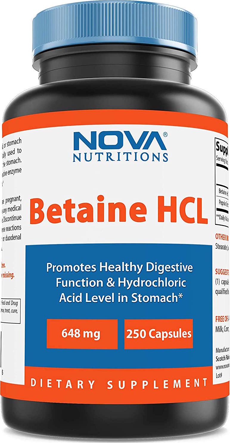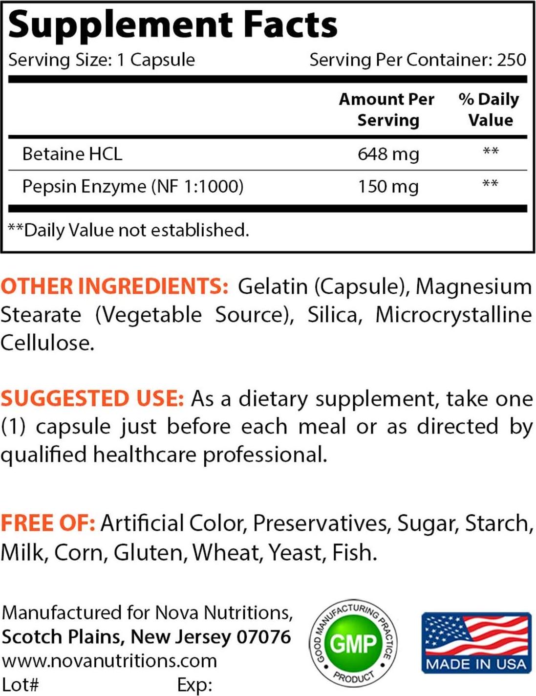 Nova Nutritions Betaine HCL with Pepsin Digestive Enzyme 648 mg 250 Capsules - Tested For Quality and Safety, Gluten Free and Non-GMO