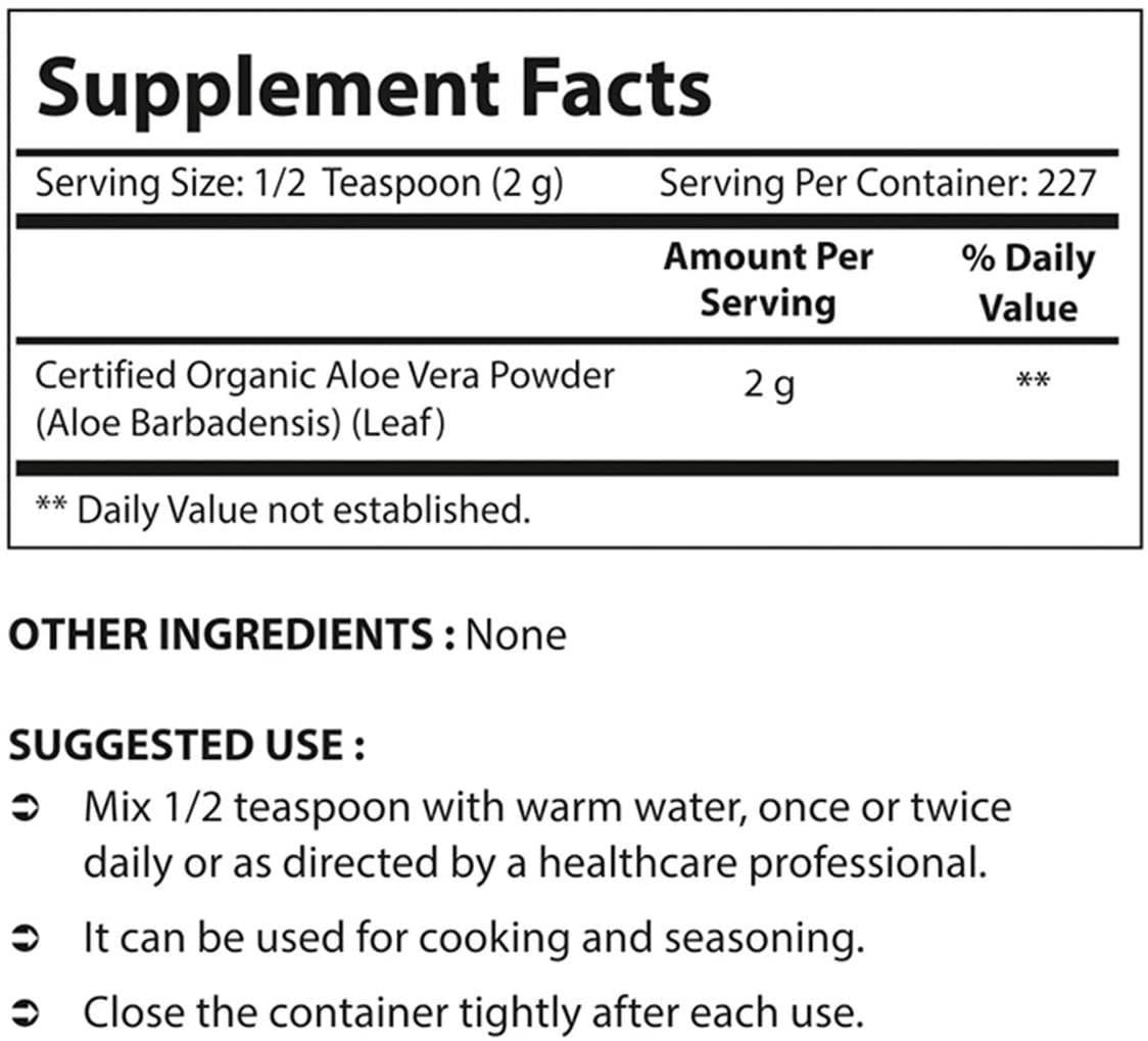 - Our Aloe Vera Powder is 100% Certified Organic, Vegan, Natural, Gluten Free, Kosher & Halal.