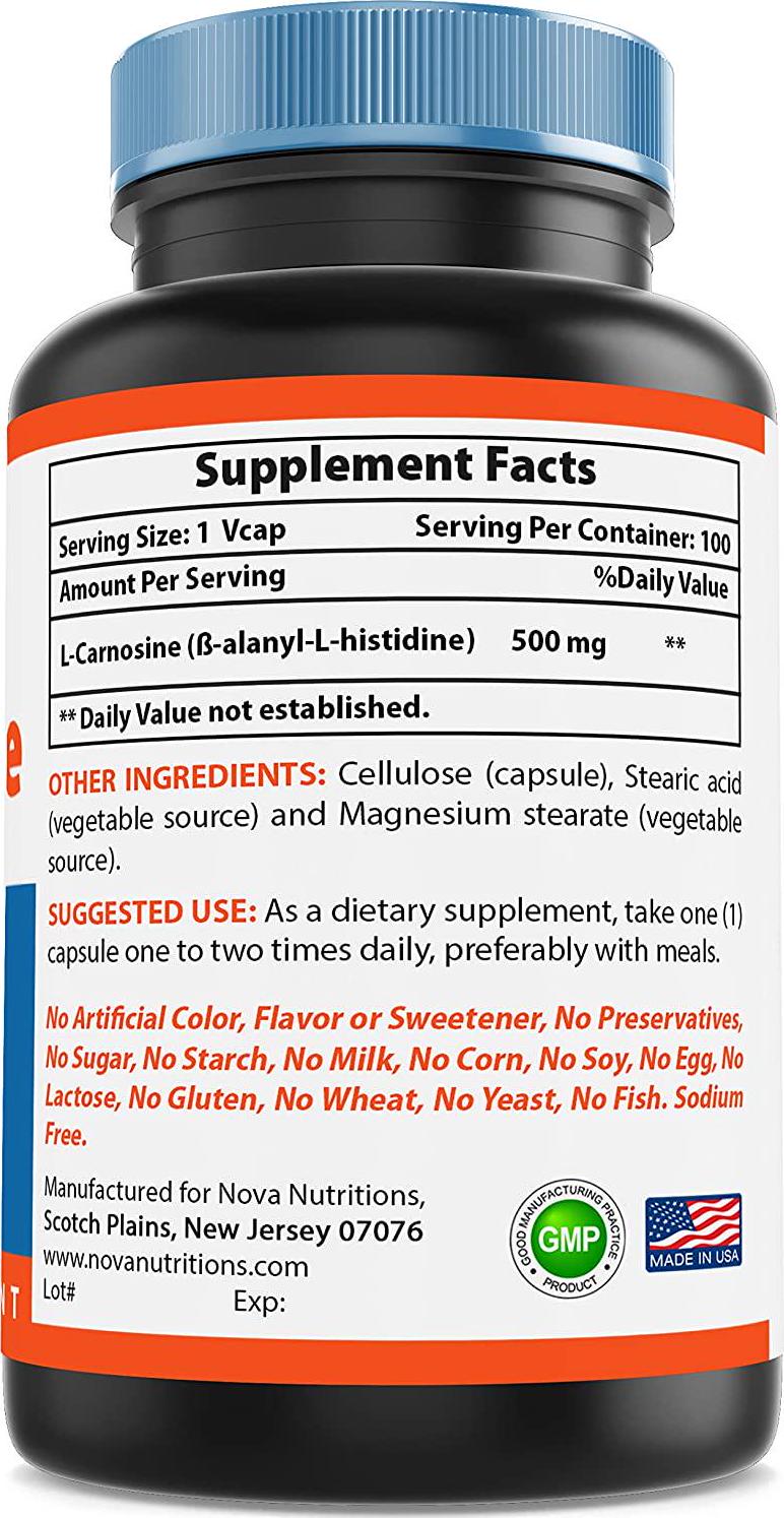 500mg, age-related decline, antioxidant support, muscle vitality, nova nutritions l-carnosine, vcaps