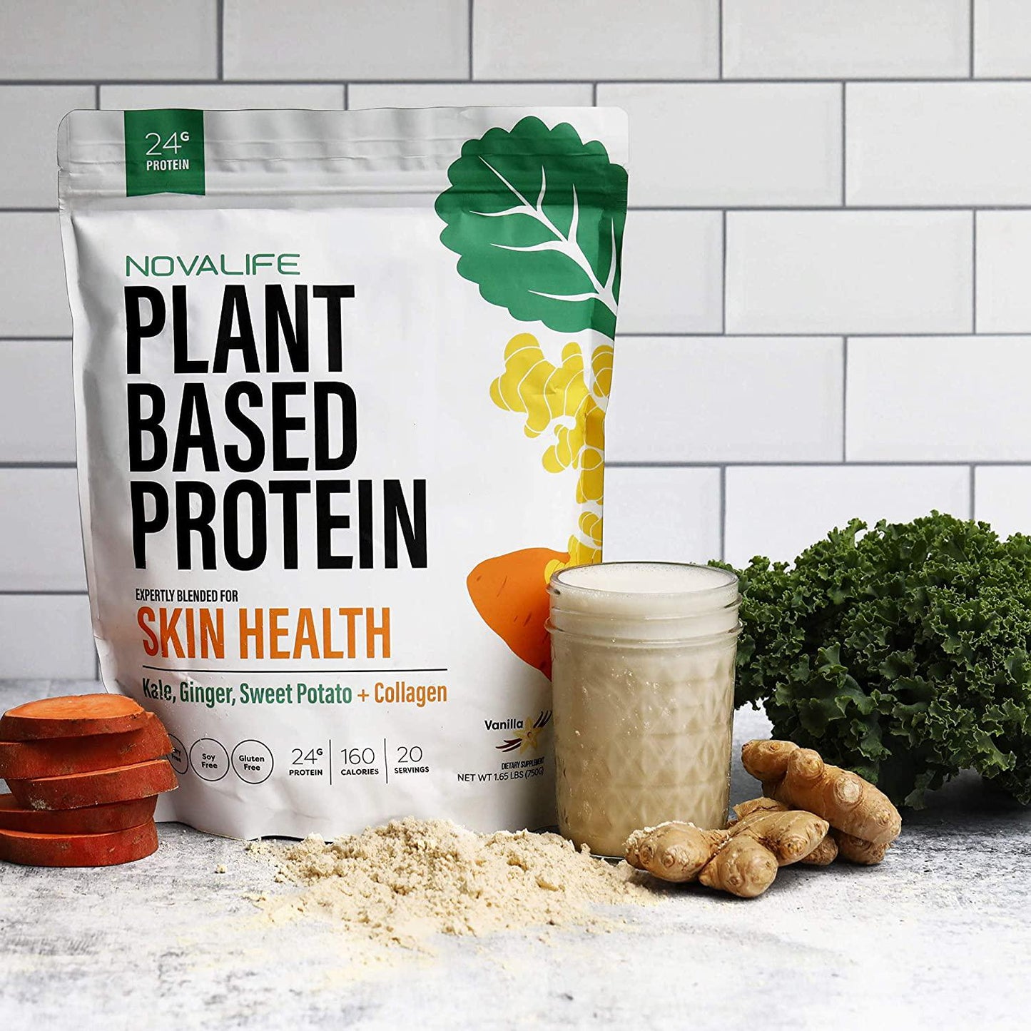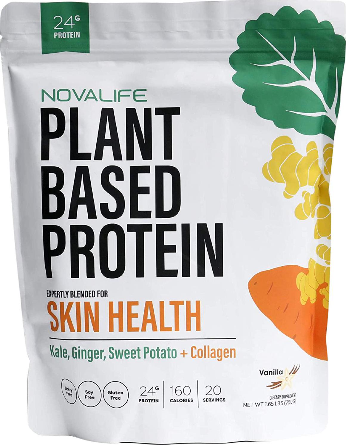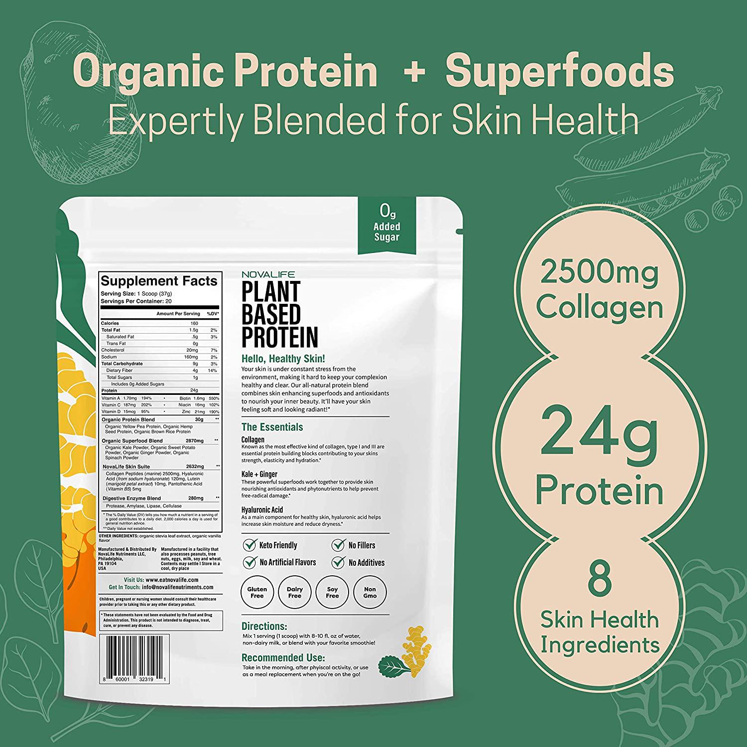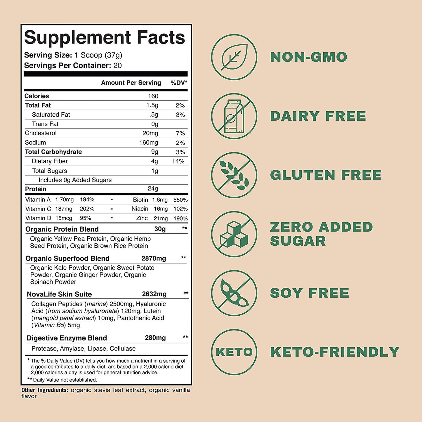 NovaLife Organic Skin Health Vanilla Plant Protein Powder, 1.65 Pounds, 20 Servings, 24g Protein, Collagen, Low Carb, Keto Friendly, Soy Free, Dairy Free, Non-GMO, Gluten Free, No Sugar Added