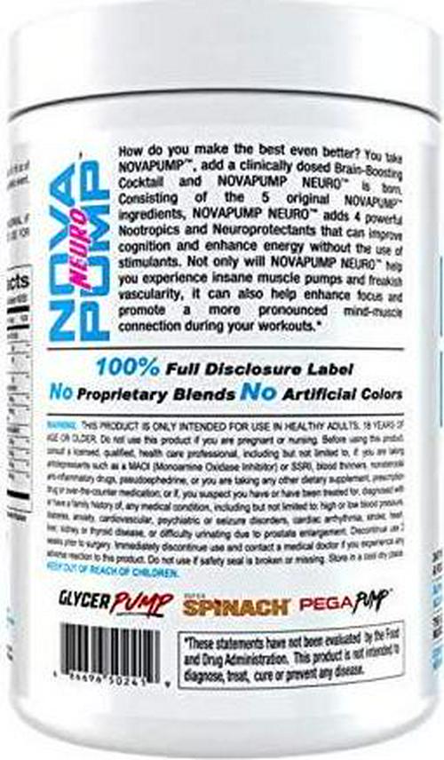 Loaded with focus enhancing nootropics and heavy doses of clinically proven nitric oxide enhancing ingredients, NOVAPUMP NEURO provides INTENSE FOCUS, ALL DAY ENERGY and MASSIVE MUSCLE PUMPS, all without the use of Caffeine or other stimulants!